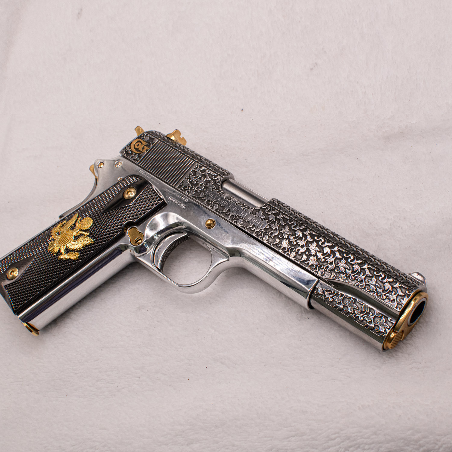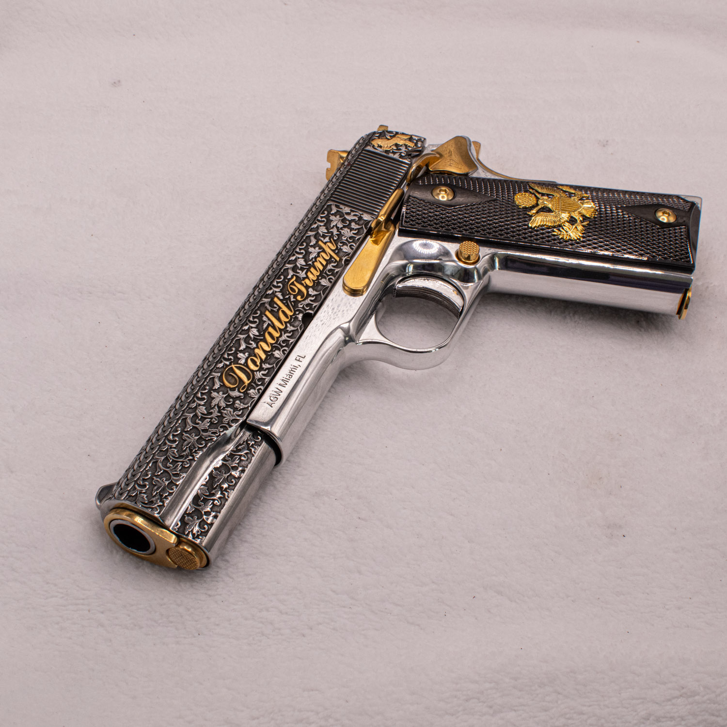 This one-of-a-kind AGW features custom engraving with an exclusive Trump design, accentuated by 24-karat gold-plated details. The surface is finished with a high-gloss polish. Every element has been crafted with precision: custom grips embossed with the Eagle  logo, and a magazine bottom adorned with a golden finish. The result is not just a firearm, but a true work of art—a statement piece that will elevate and enrich any collector’s showcase.