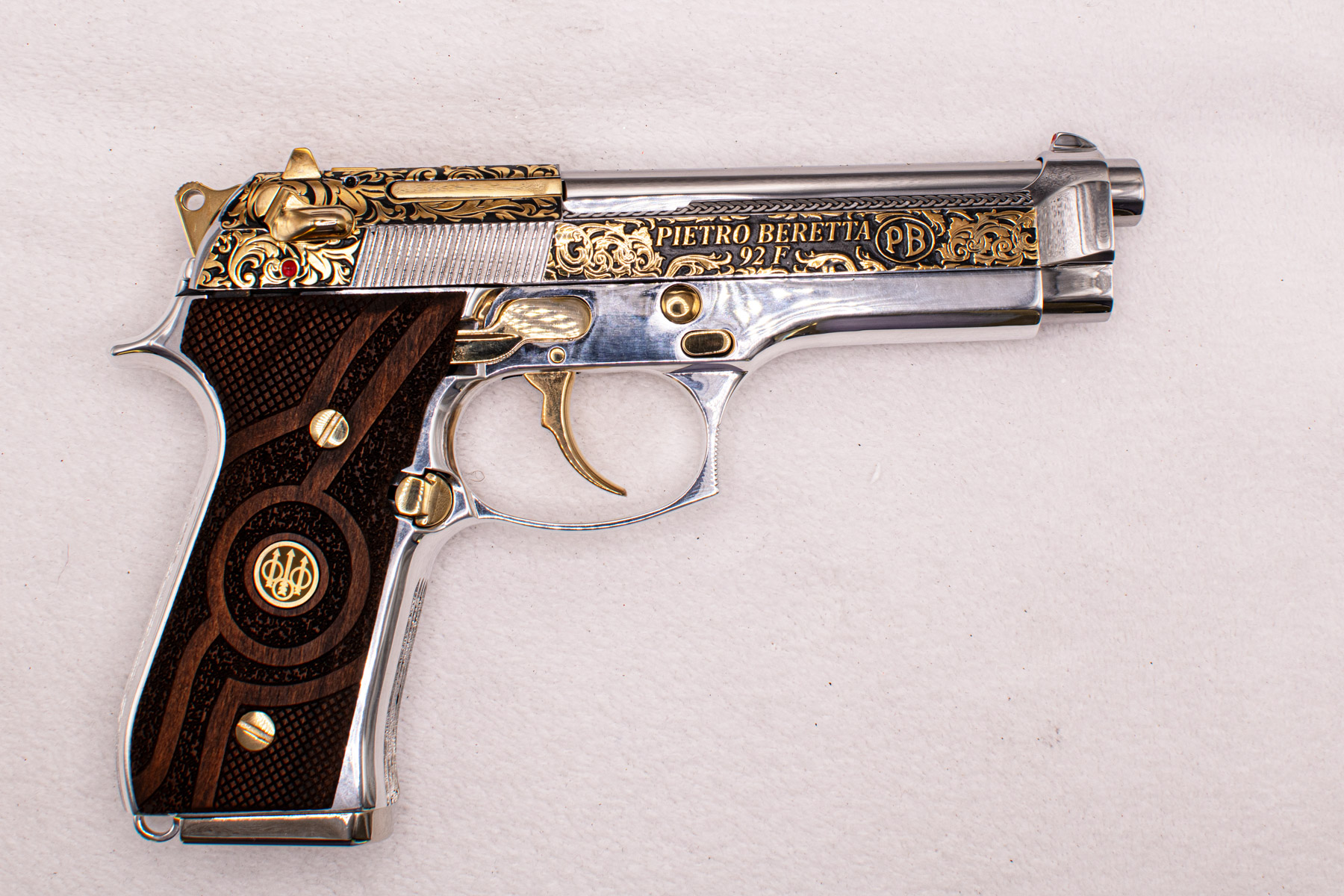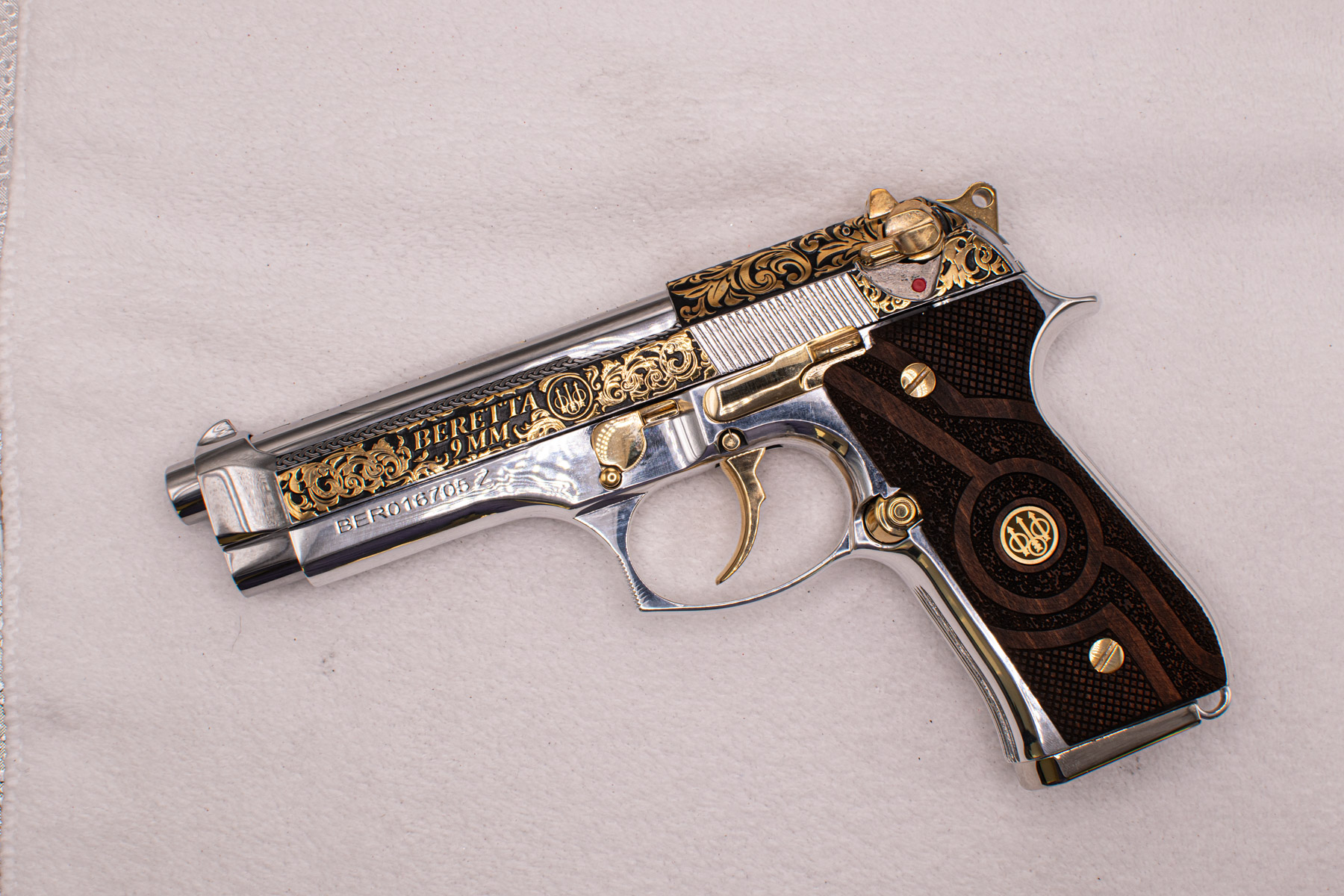 This exclusive Beretta 92F 9mm is elevated to the level of fine art through its custom engraving and 24-karat gold-plated accents. The steel has been high-polished to a mirror finish, applied by hand with meticulous craftsmanship.