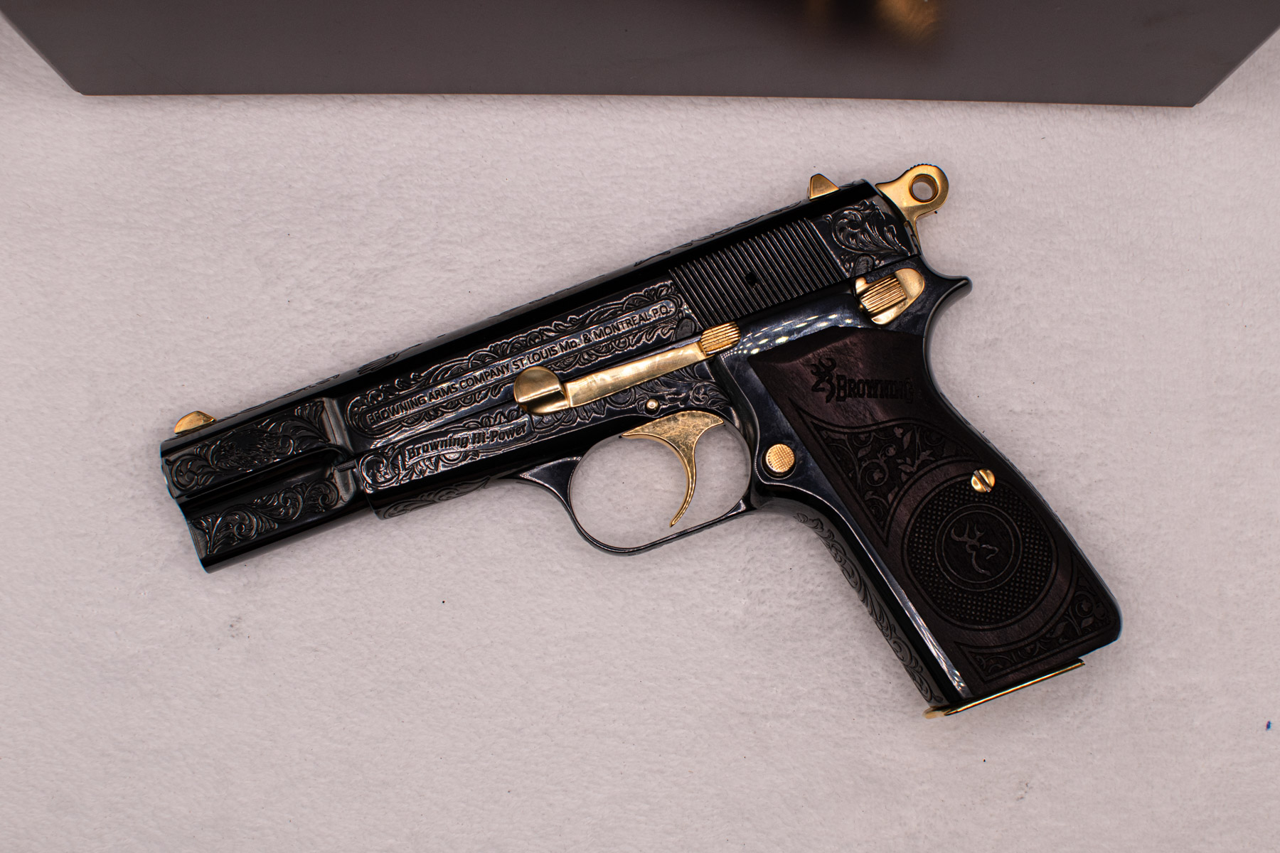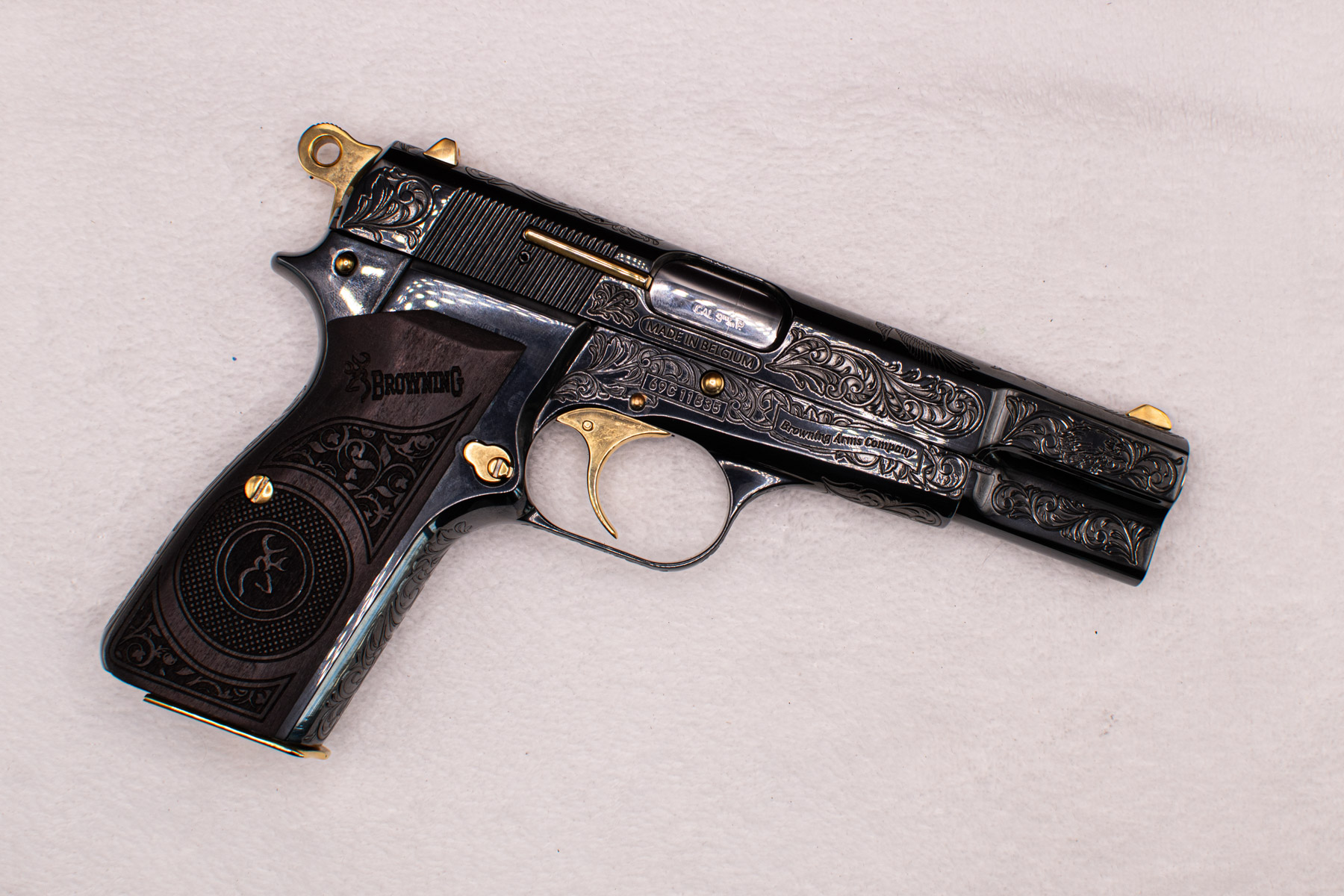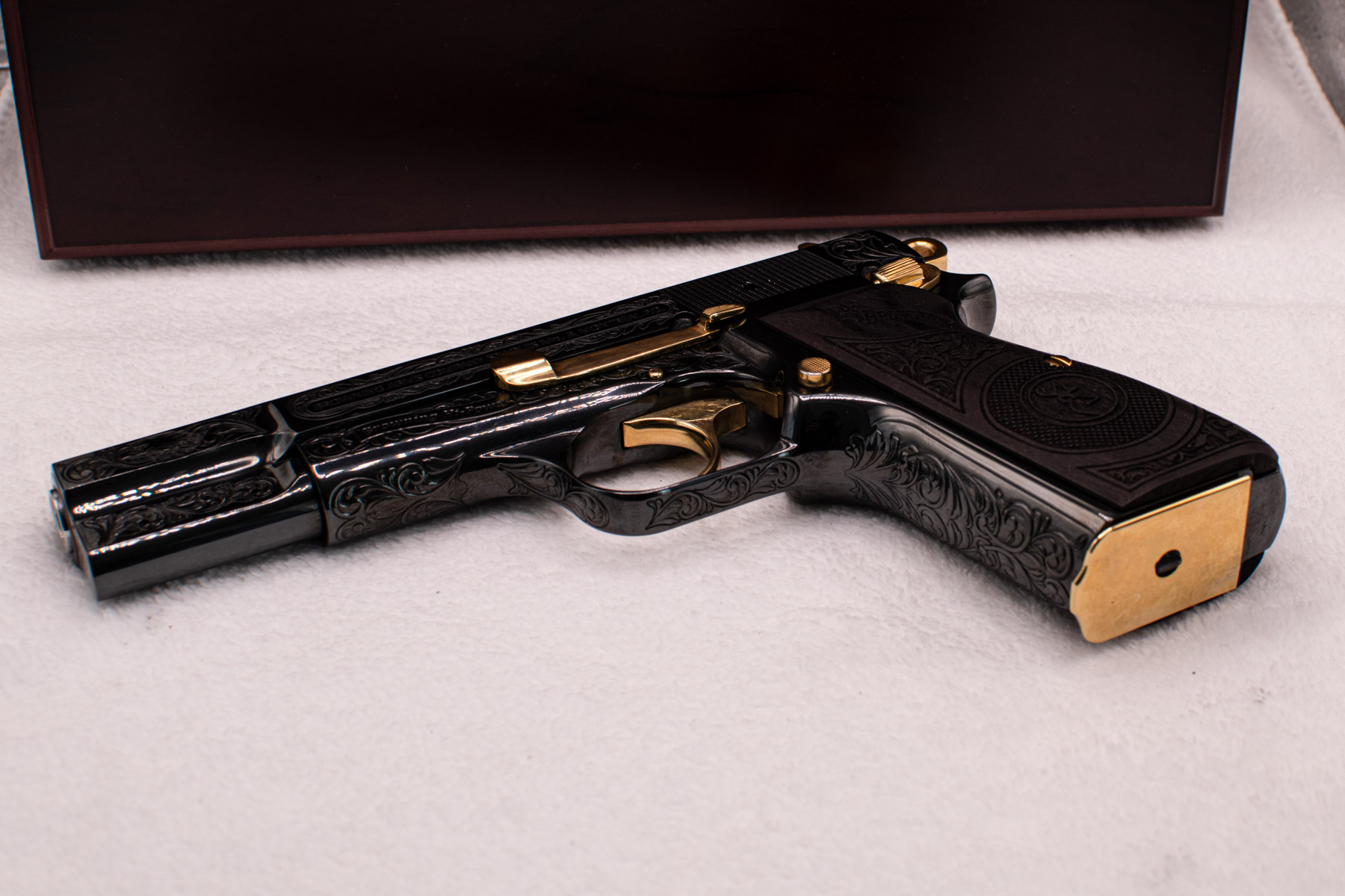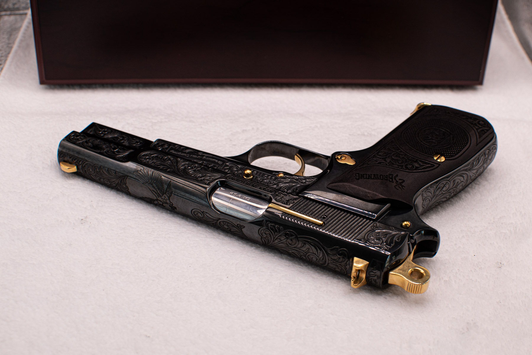 A true work of art — this custom pistol features hand engraving, 24K gold-plated details, and a hand-applied Royal Blue finish. Crafted from high-polished stainless steel or nickel-plated metal, it includes custom logo grips and a polished or gold-plated magazine base.
