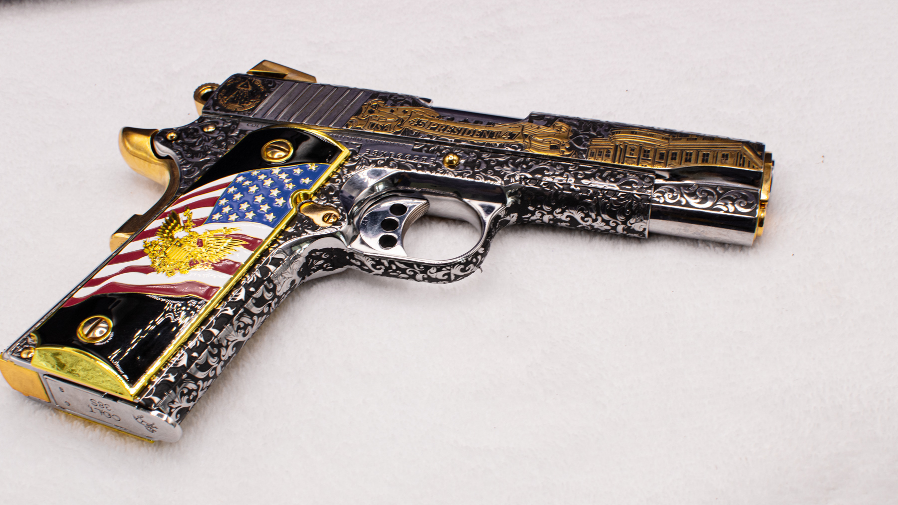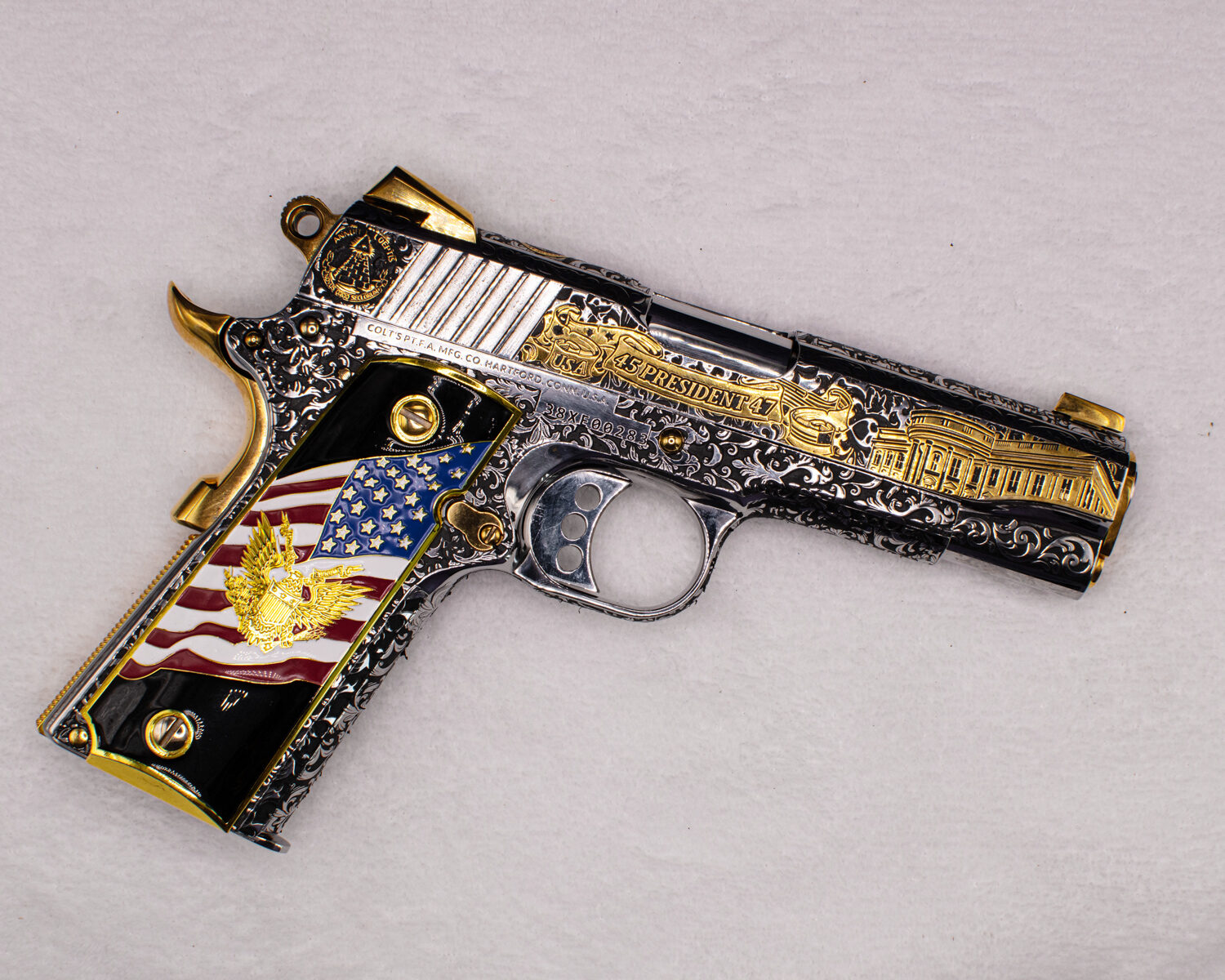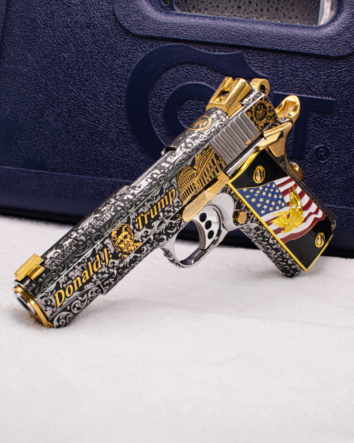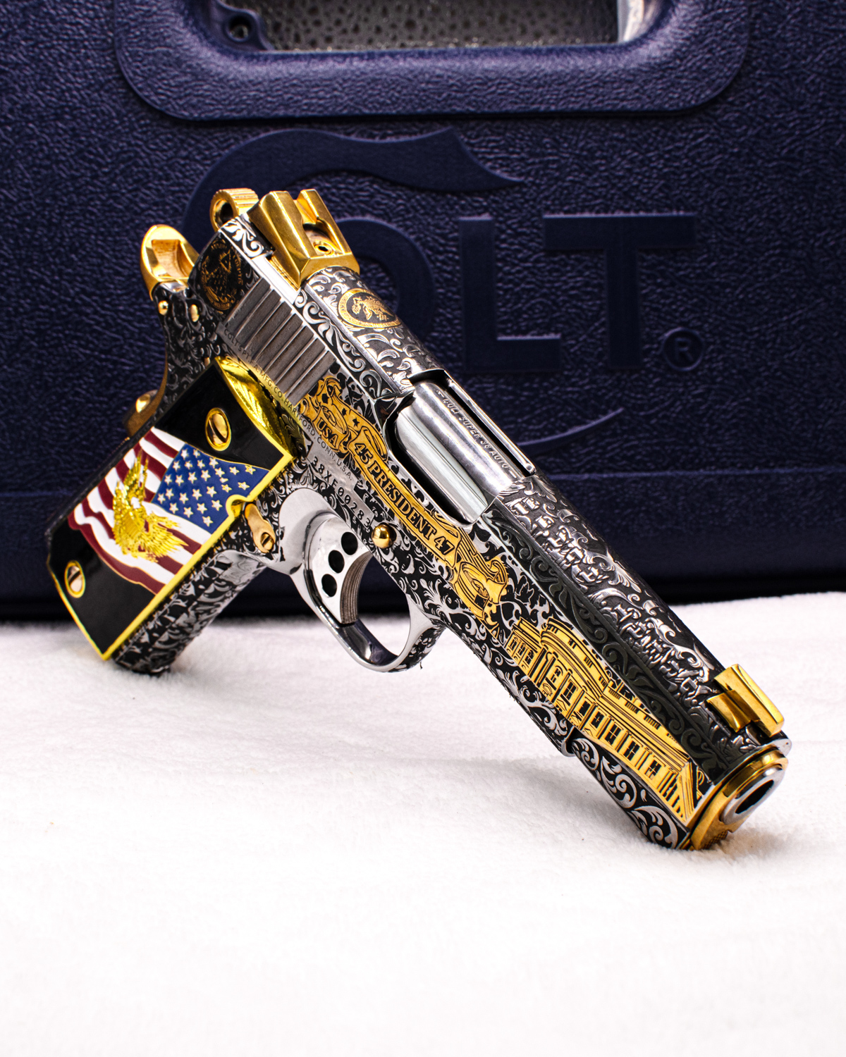This one-of-a-kind Colt features custom engraving with an exclusive design, accentuated by 24-karat gold-plated details. The surface is finished with a high-gloss polish, while the frame is enhanced with hand-applied royal blue coating for a striking contrast.