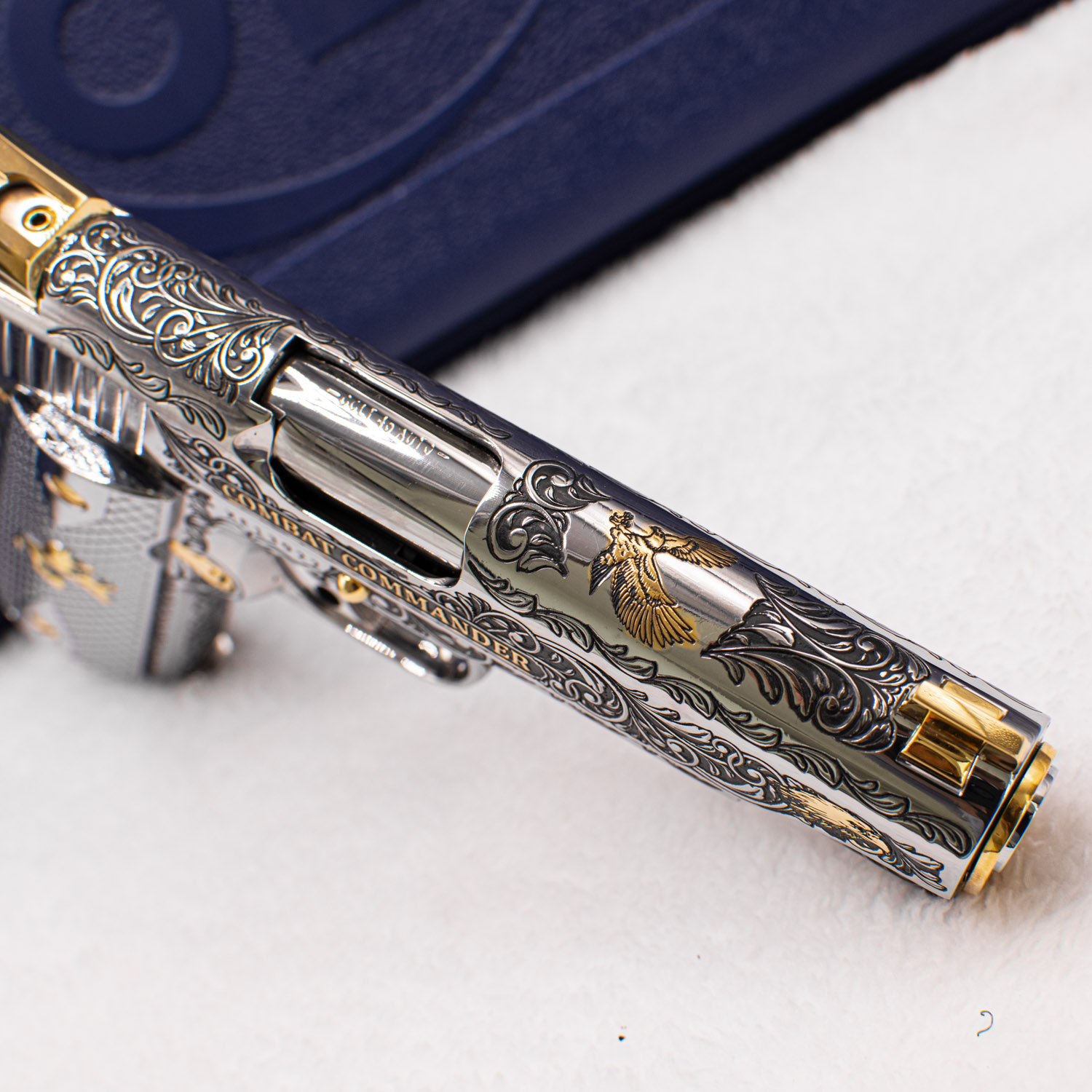 This one-of-a-kind Colt features custom engraving with an exclusive design, accentuated by 24-karat gold-plated details. The surface is finished with a high-gloss polish, while the frame is enhanced with hand-applied royal blue coating for a striking contrast.