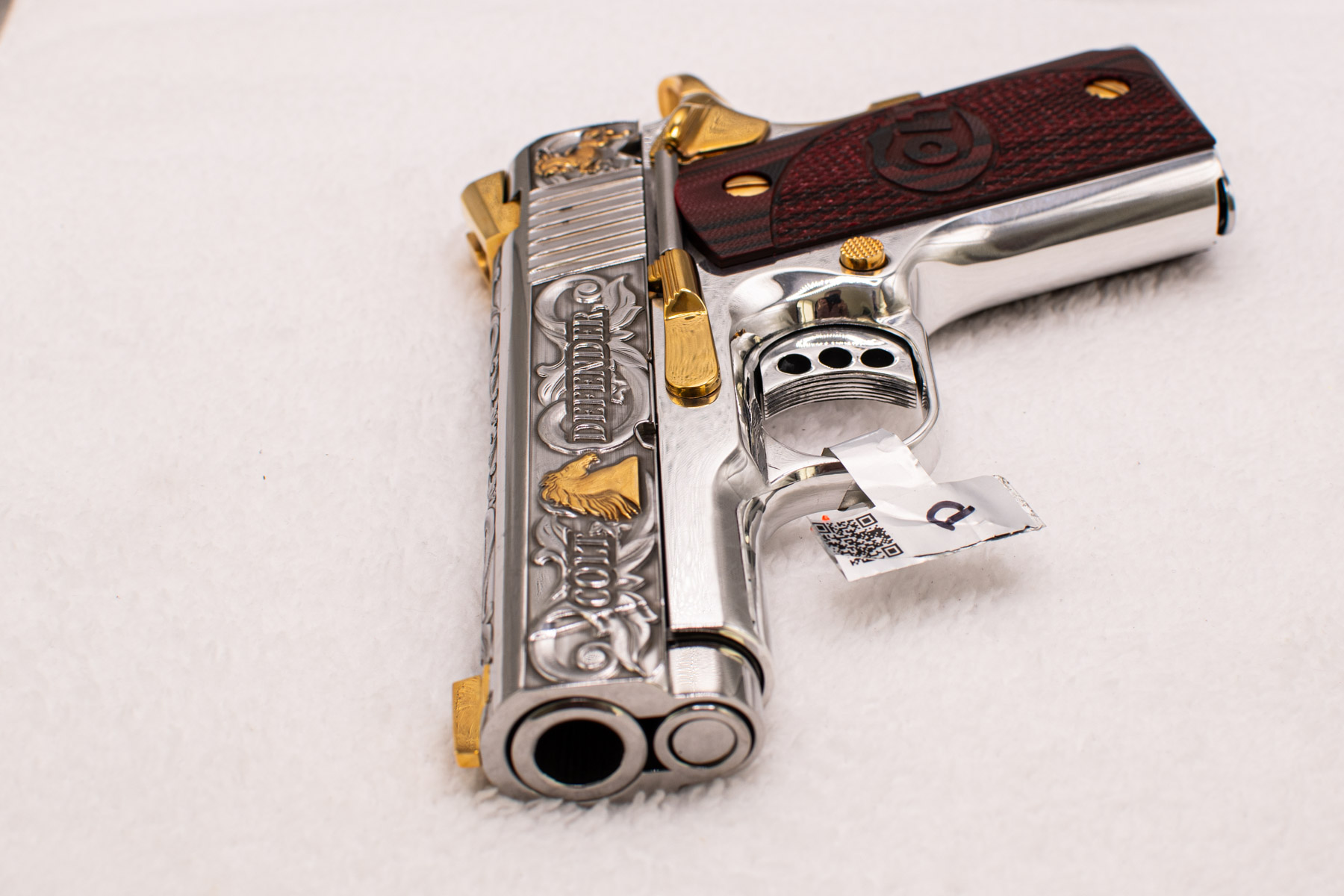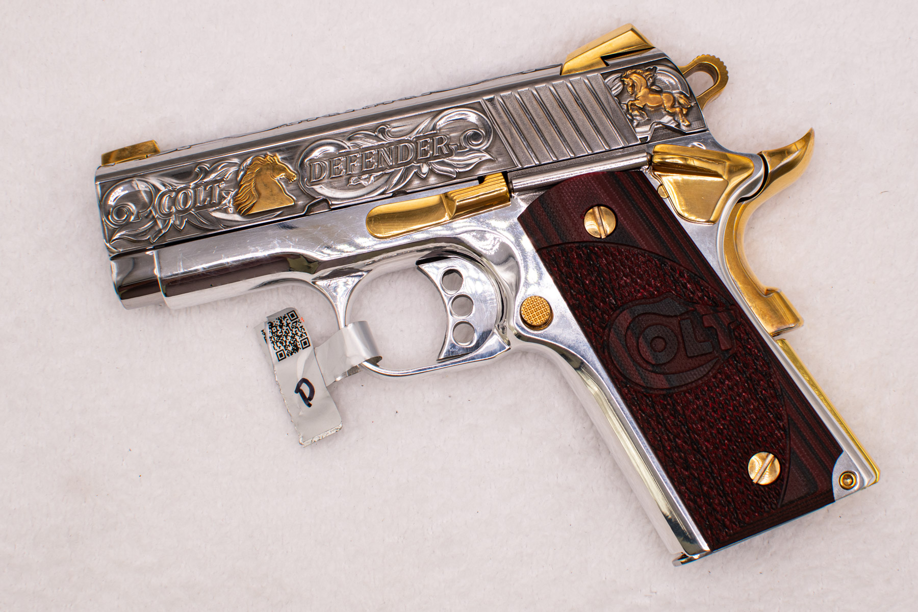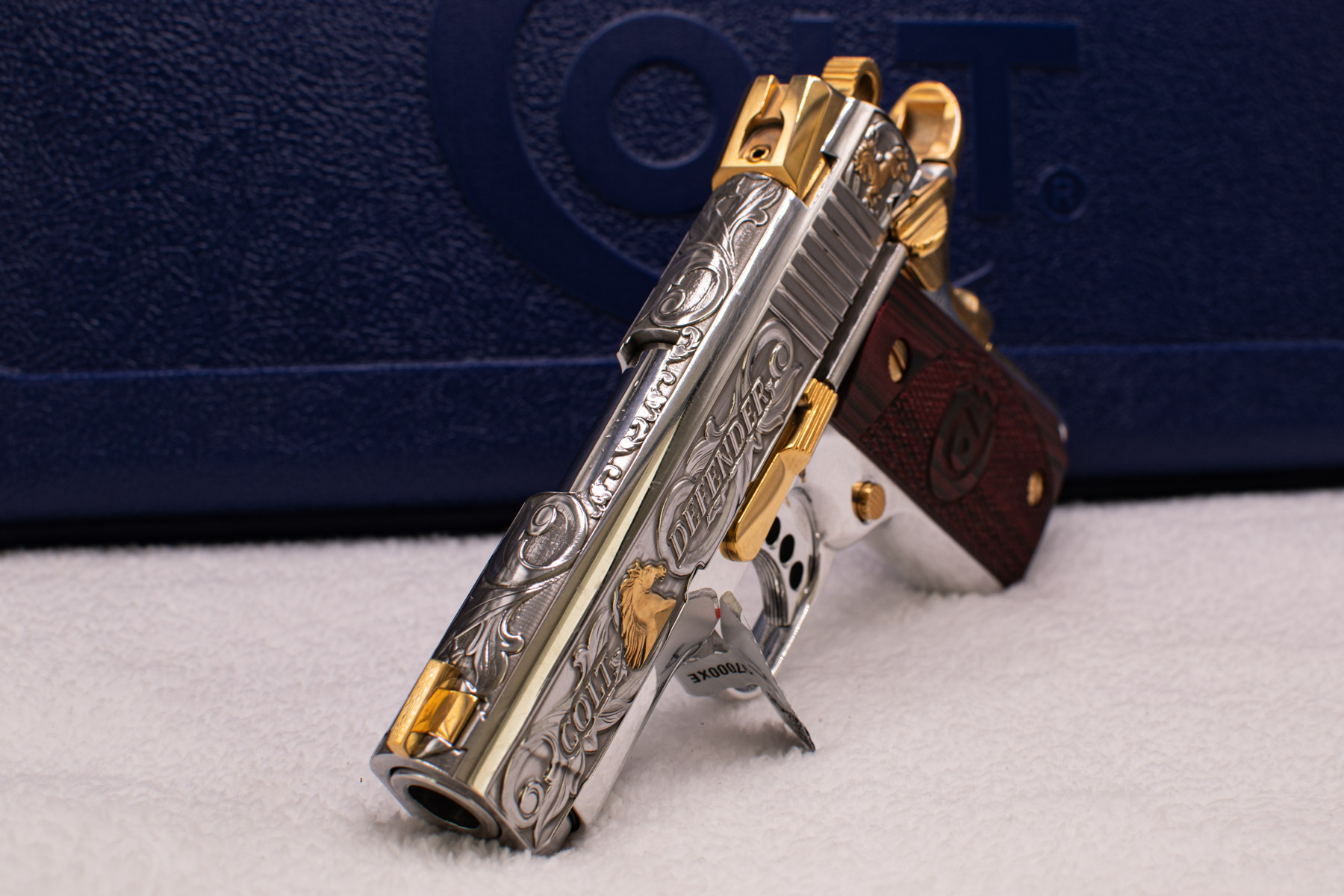 This exclusive Colt Defender is elevated to the level of fine art through its custom engraving and 24-karat gold-plated accents. The steel has been high-polished to a mirror finish.