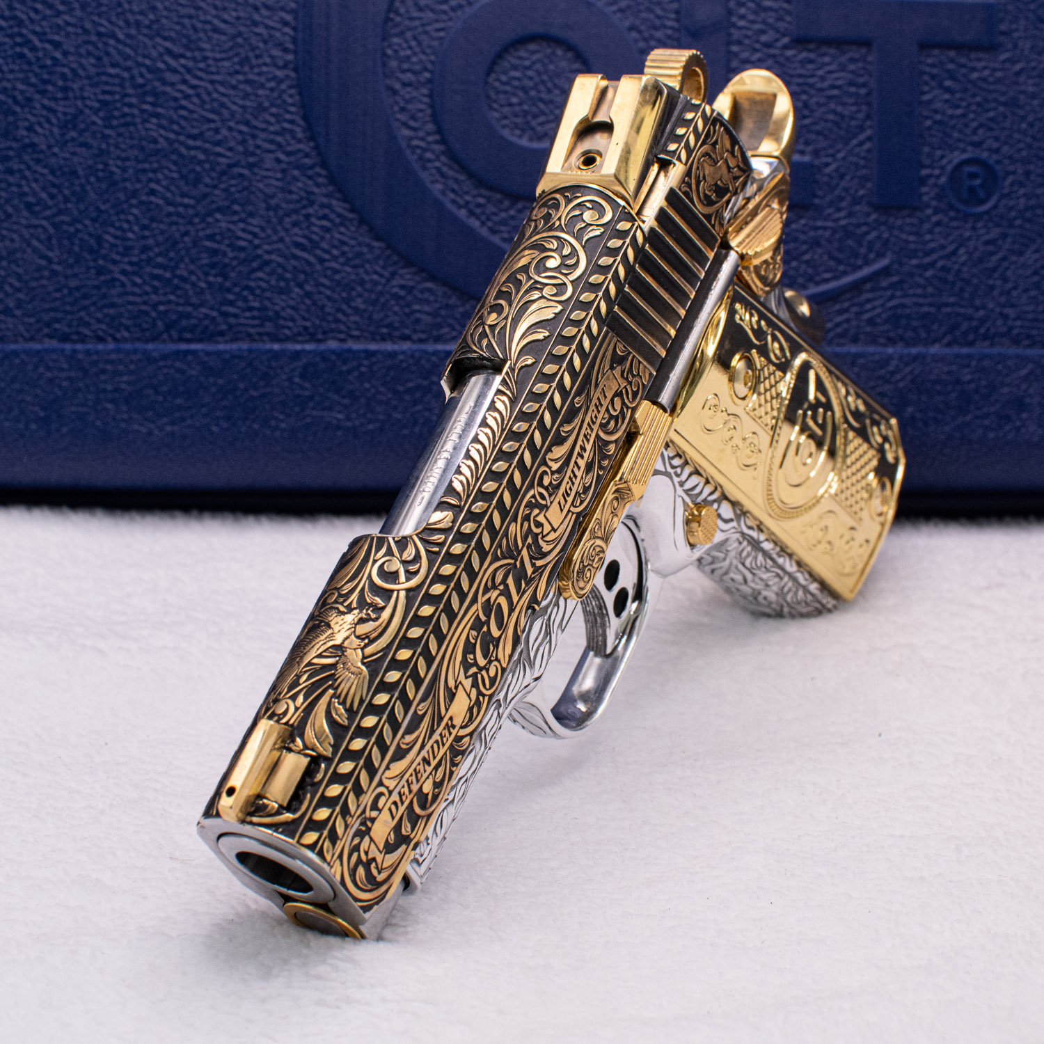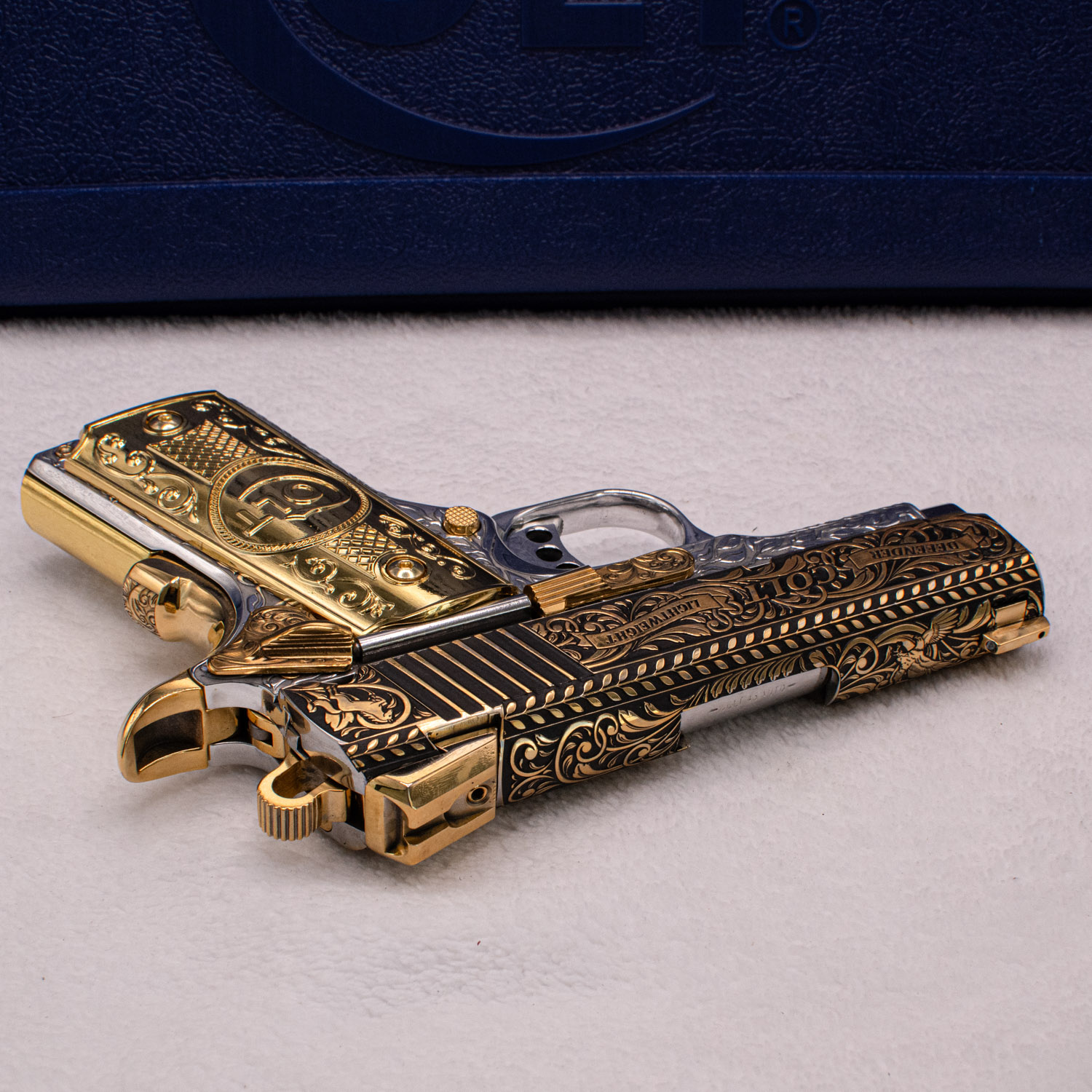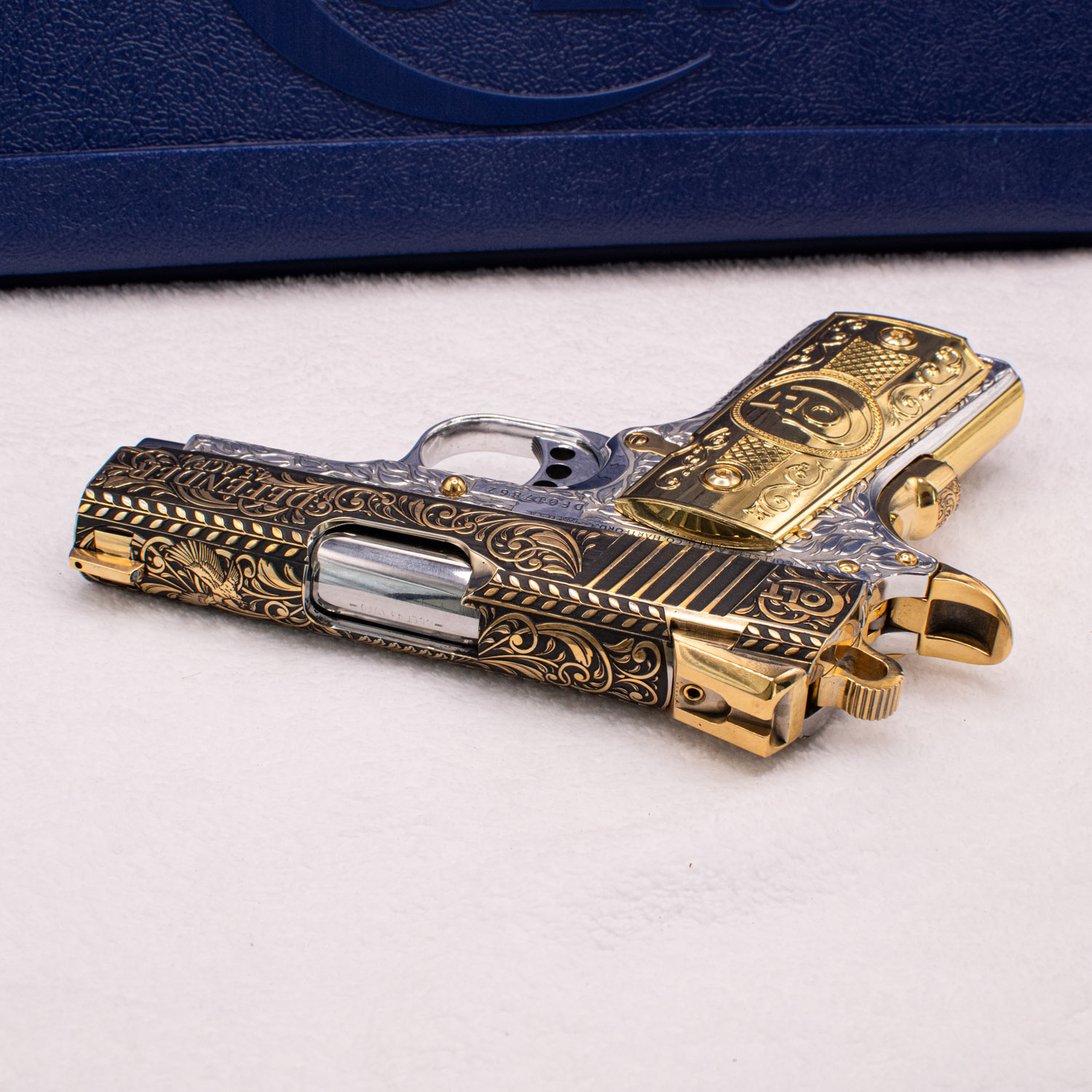 This one-of-a-kind Colt features custom engraving with an exclusive design, accentuated by 24-karat gold-plated details. The surface is finished with a high-gloss polish, while the frame is enhanced with hand-applied royal blue coating for a striking contrast.