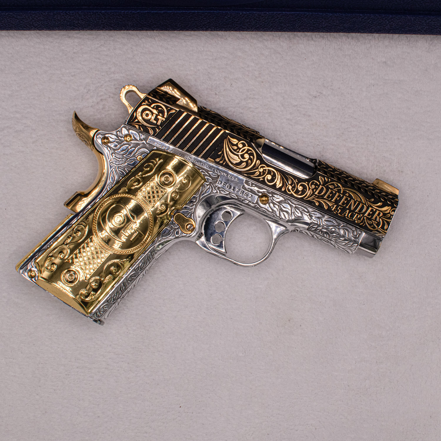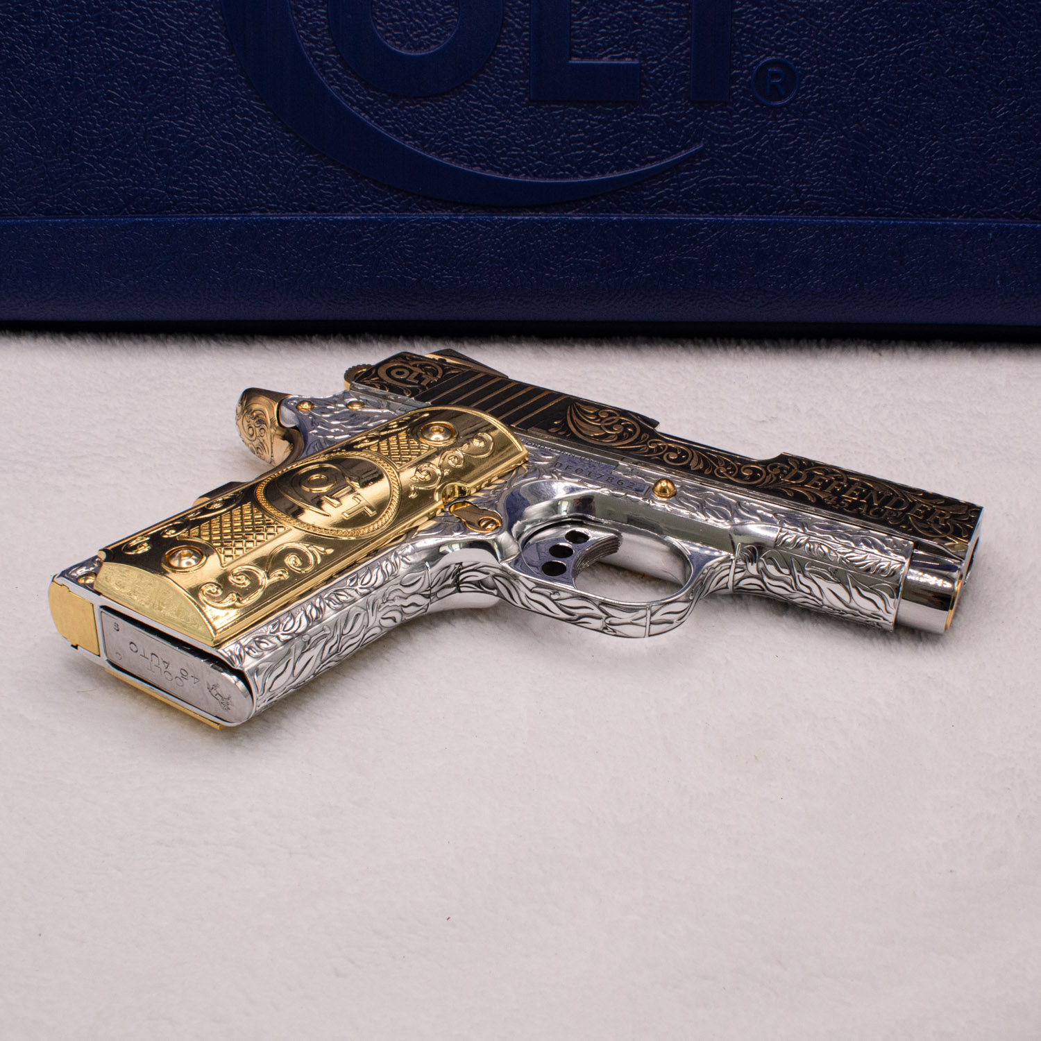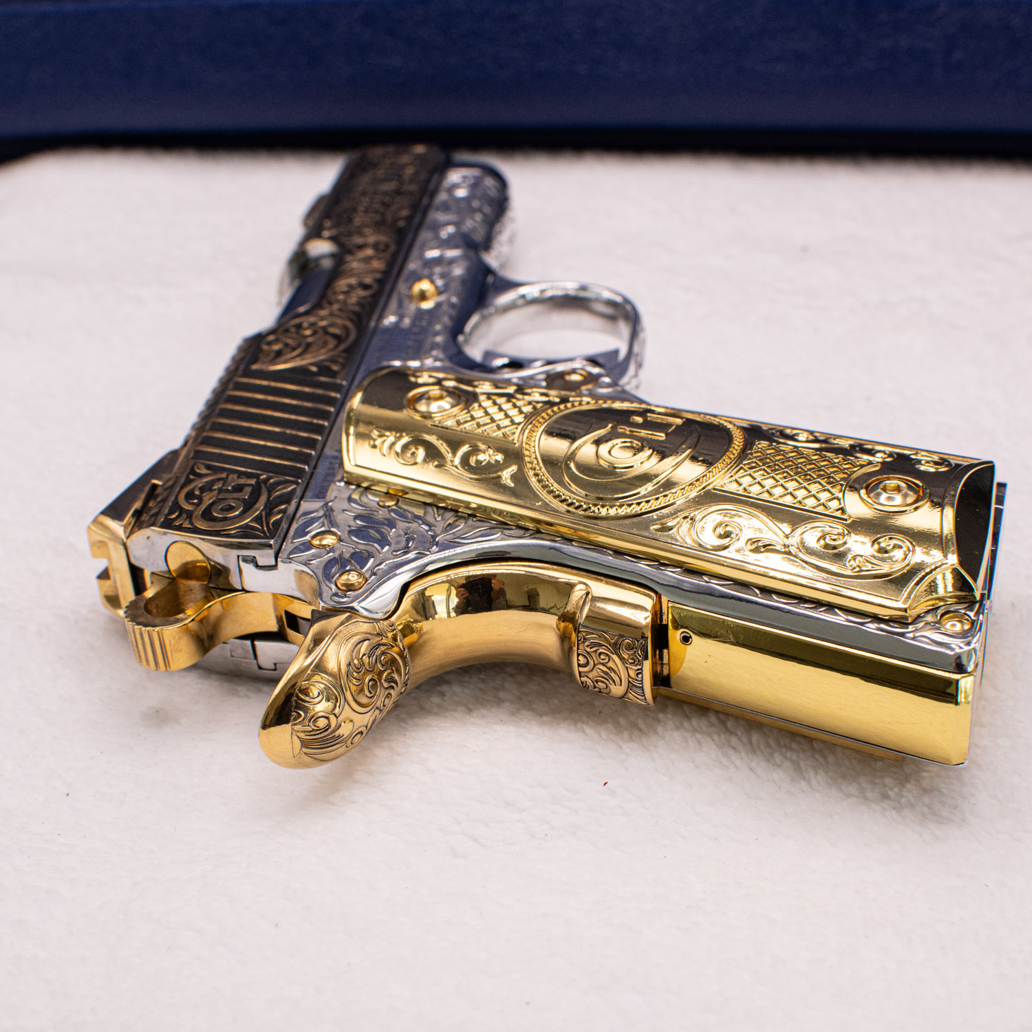 This one-of-a-kind Colt features custom engraving with an exclusive design, accentuated by 24-karat gold-plated details. The surface is finished with a high-gloss polish, while the frame is enhanced with hand-applied royal blue coating for a striking contrast.