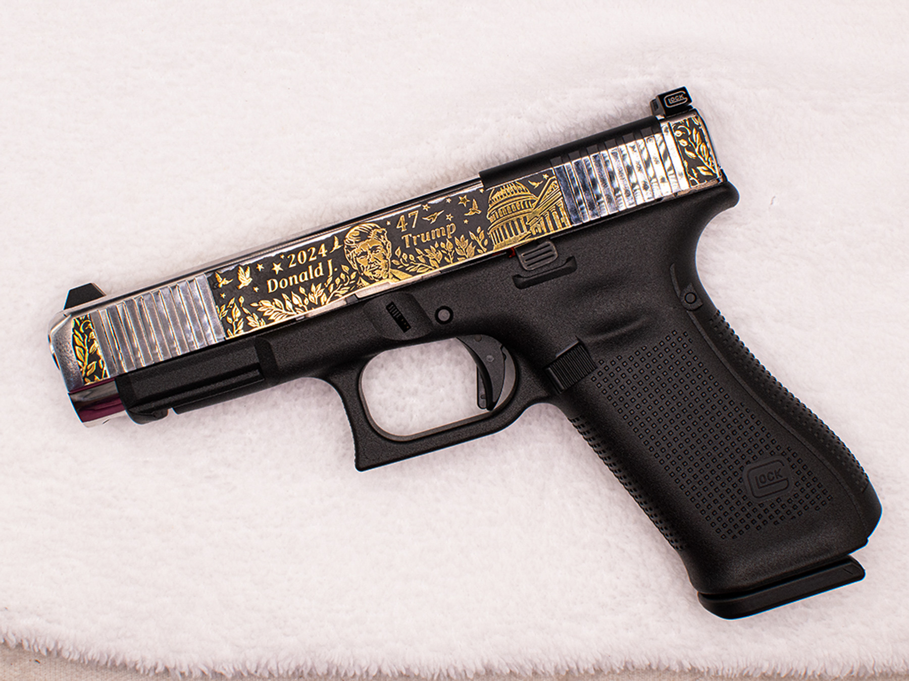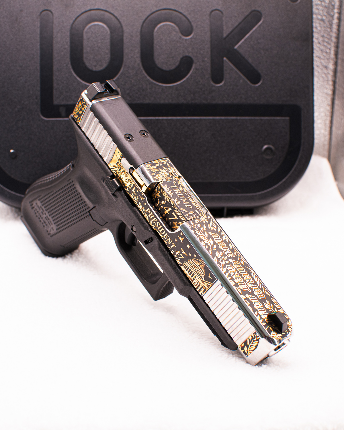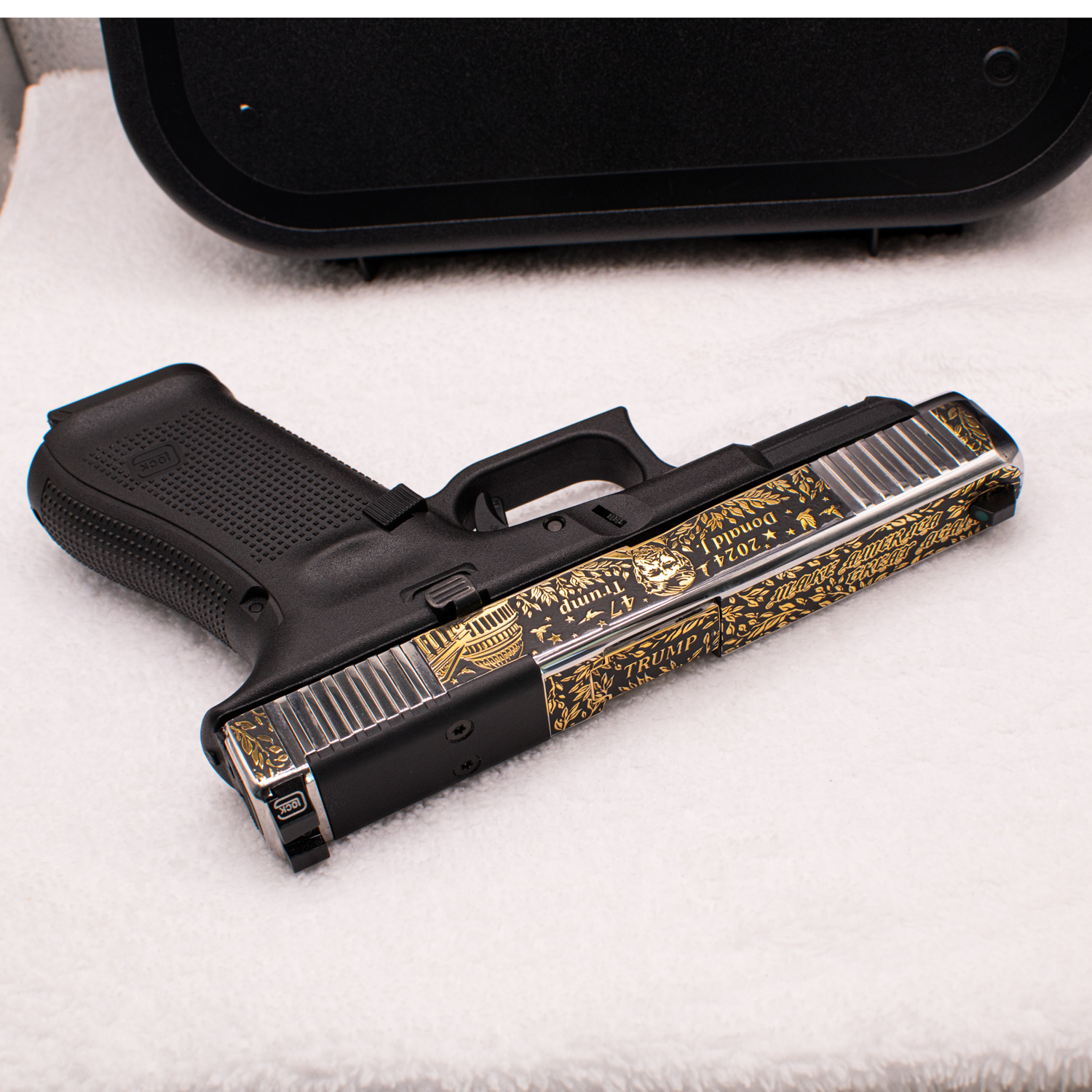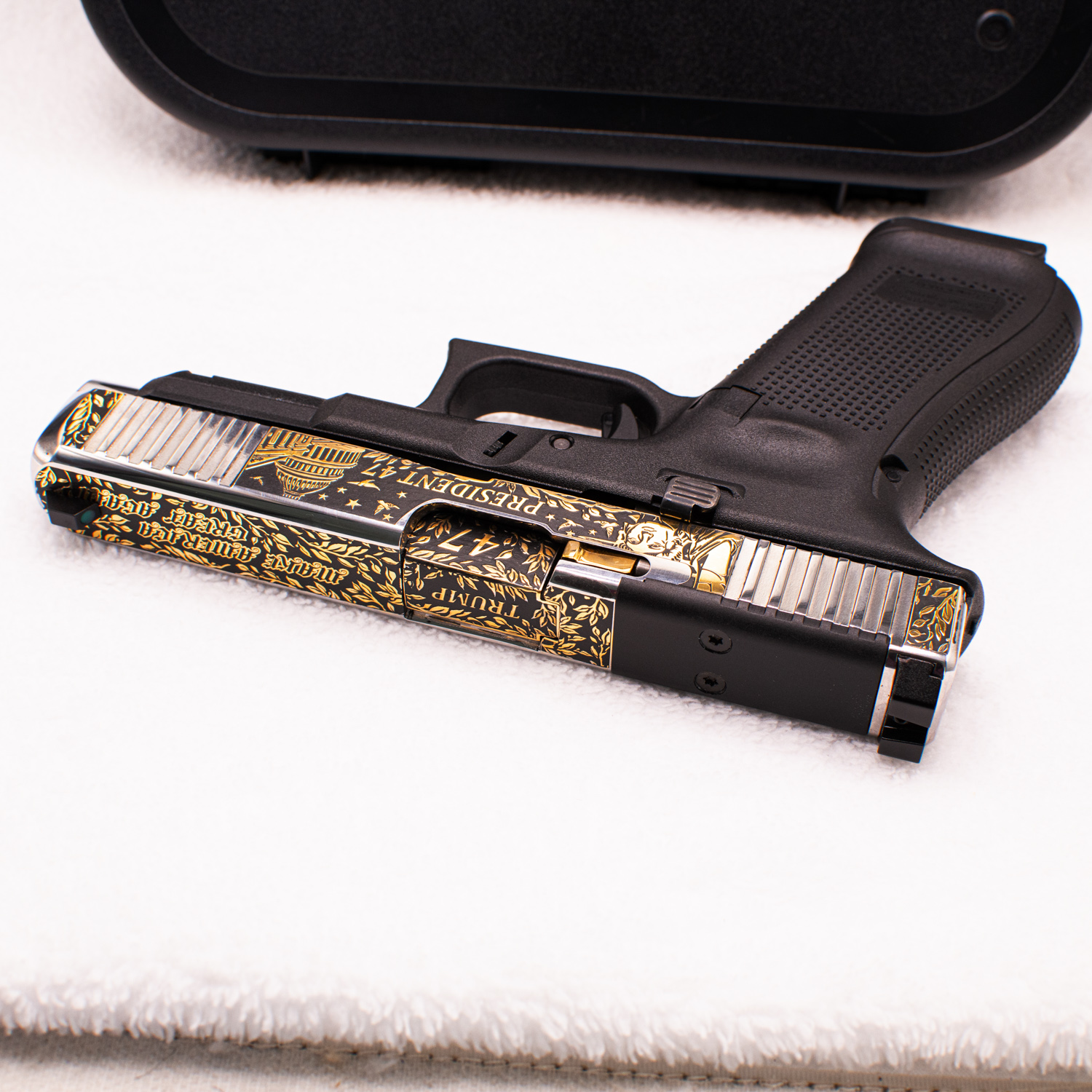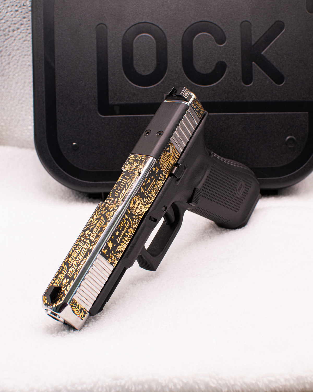 A true work of art — this custom pistol features laser engraving slide, 24K gold-plated details. High polished or gold-plated magazine base.