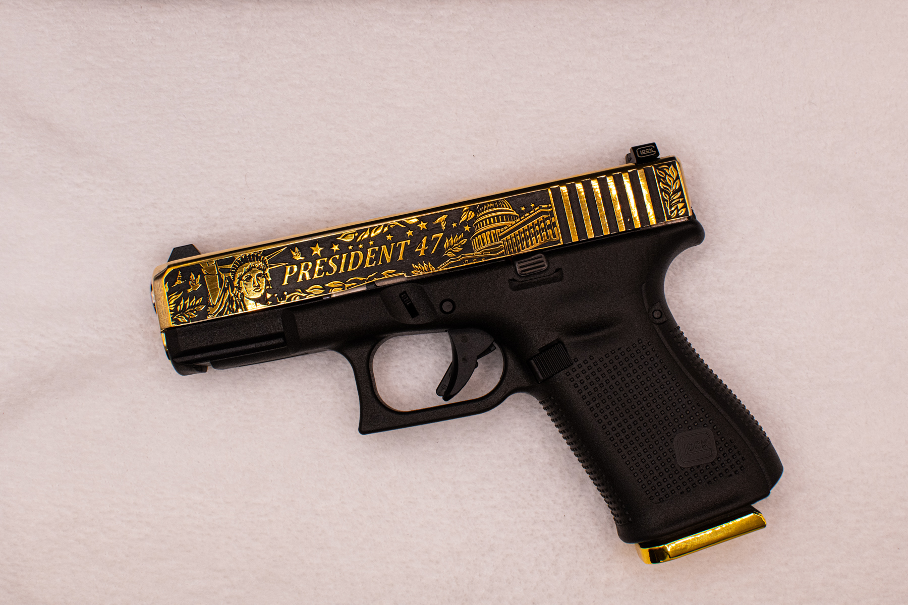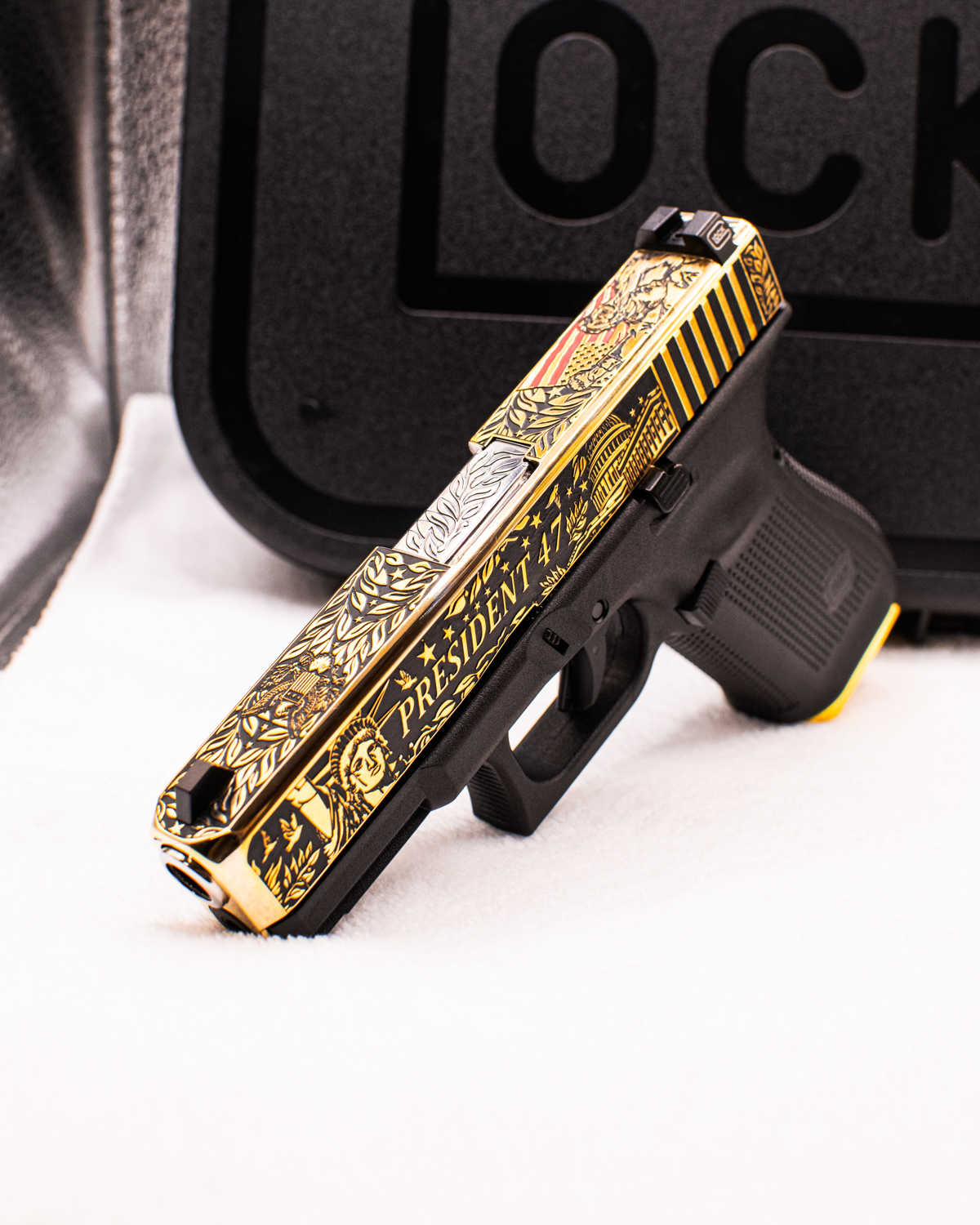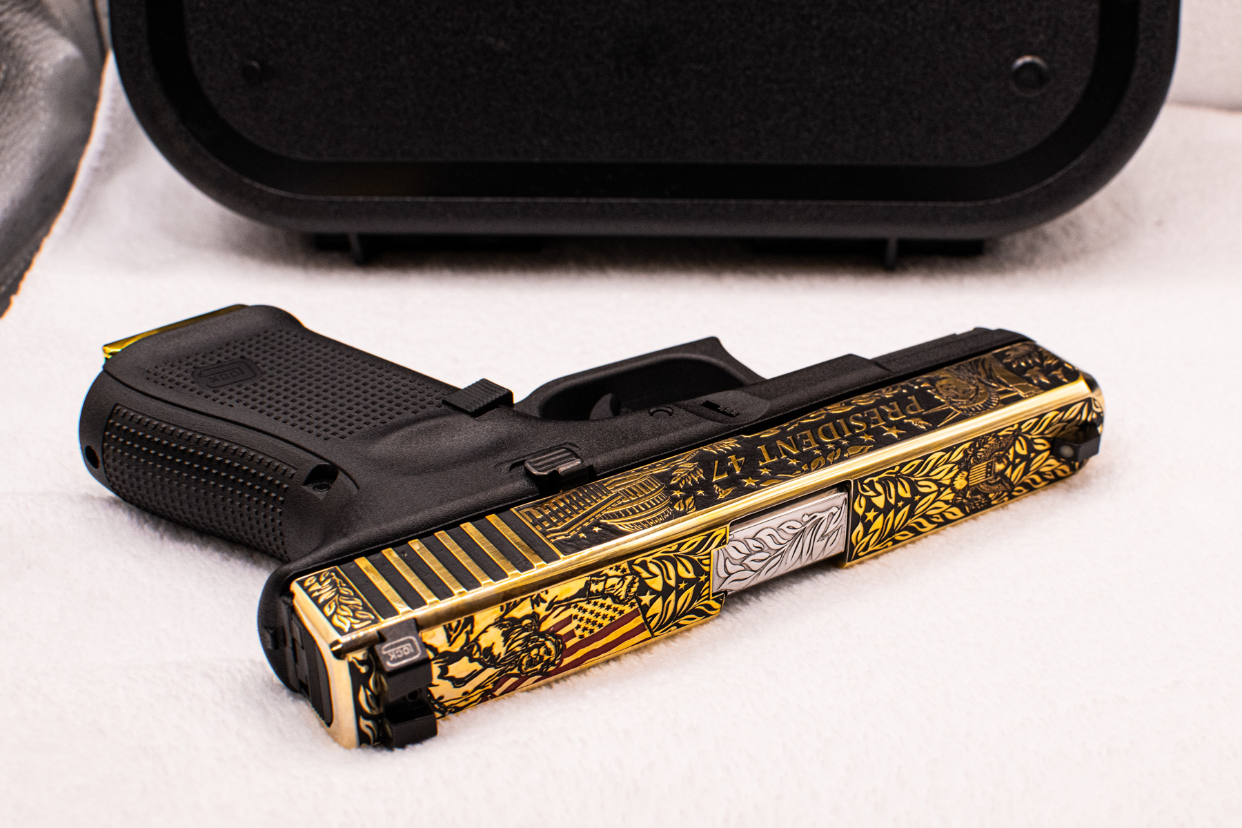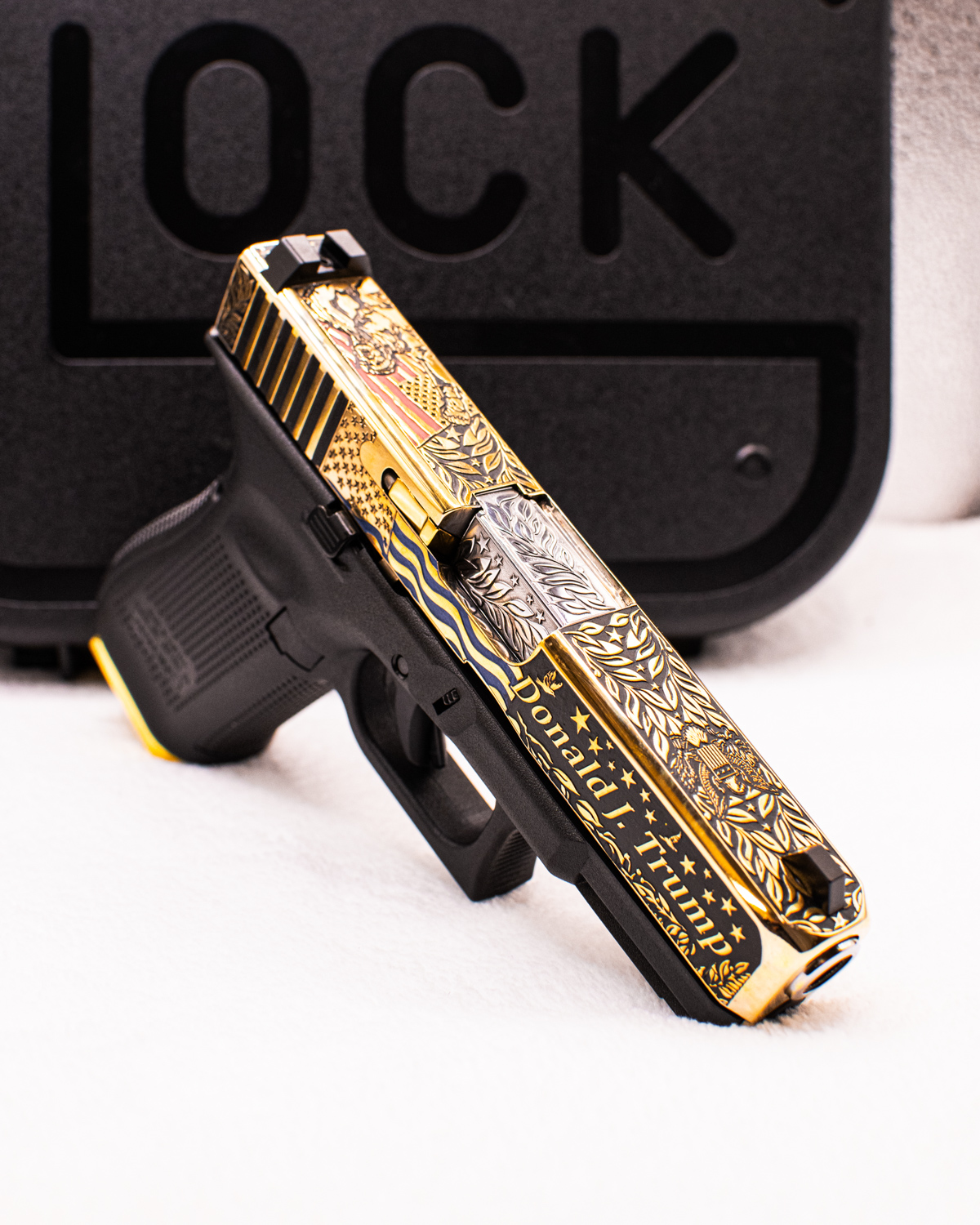 A true work of art — this custom pistol features laser engraving slide, 24K gold-plated details. High polished or gold-plated magazine base.