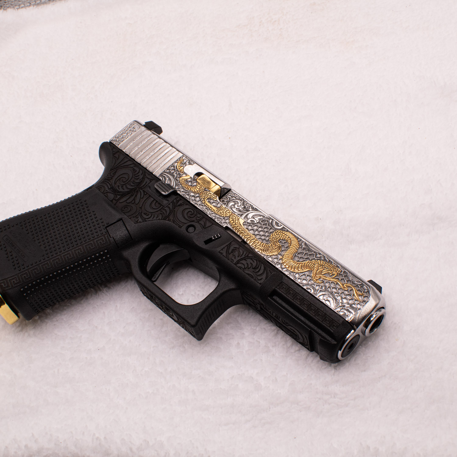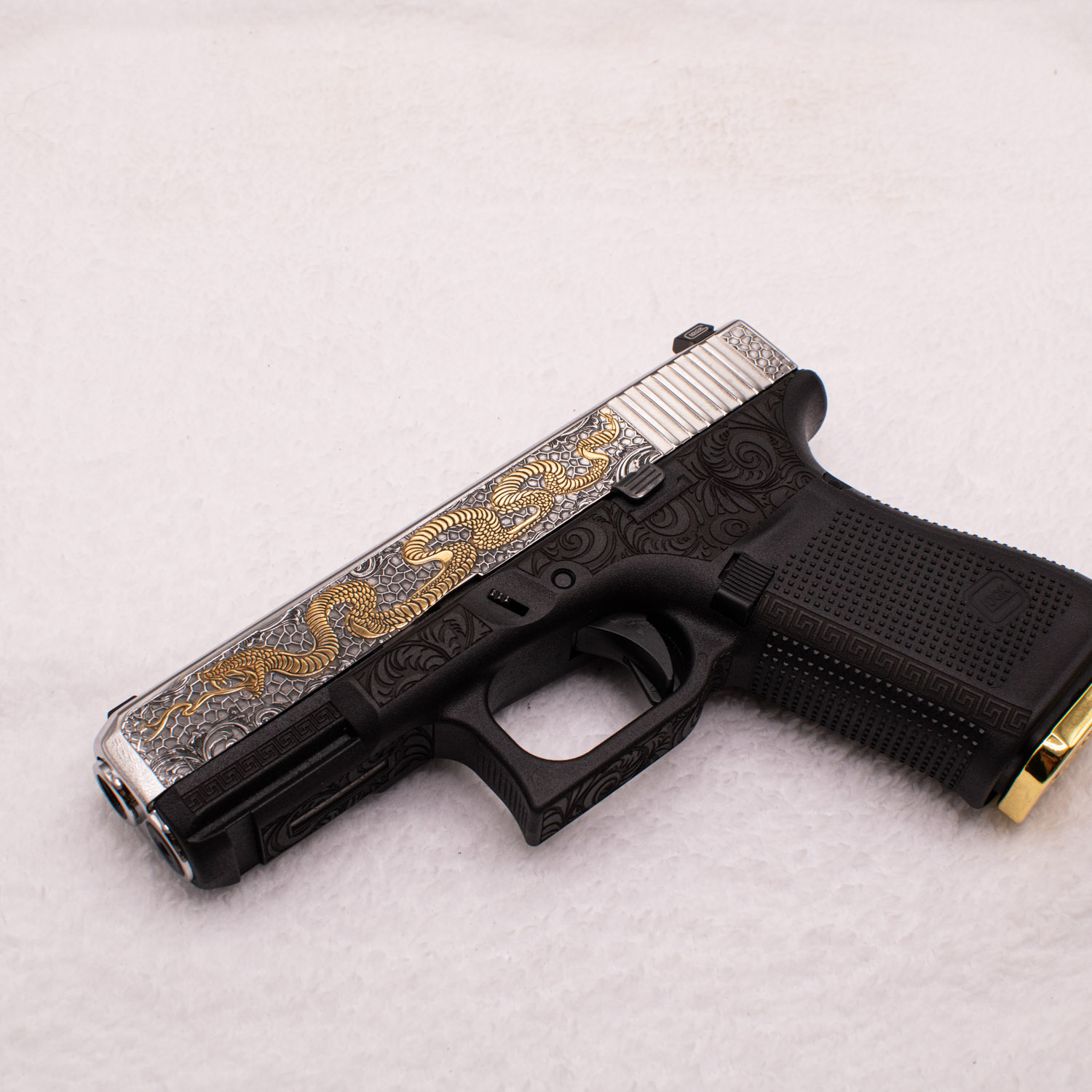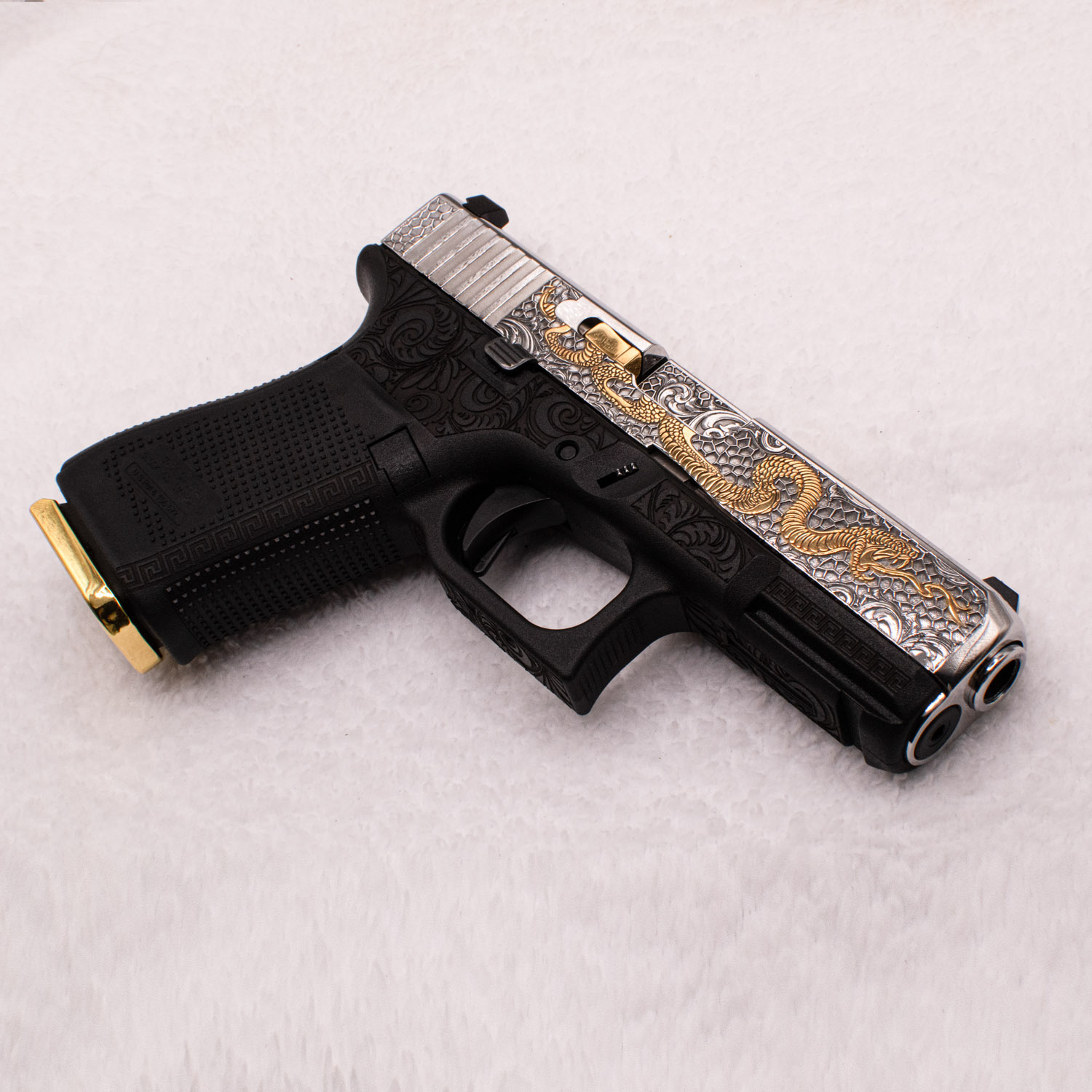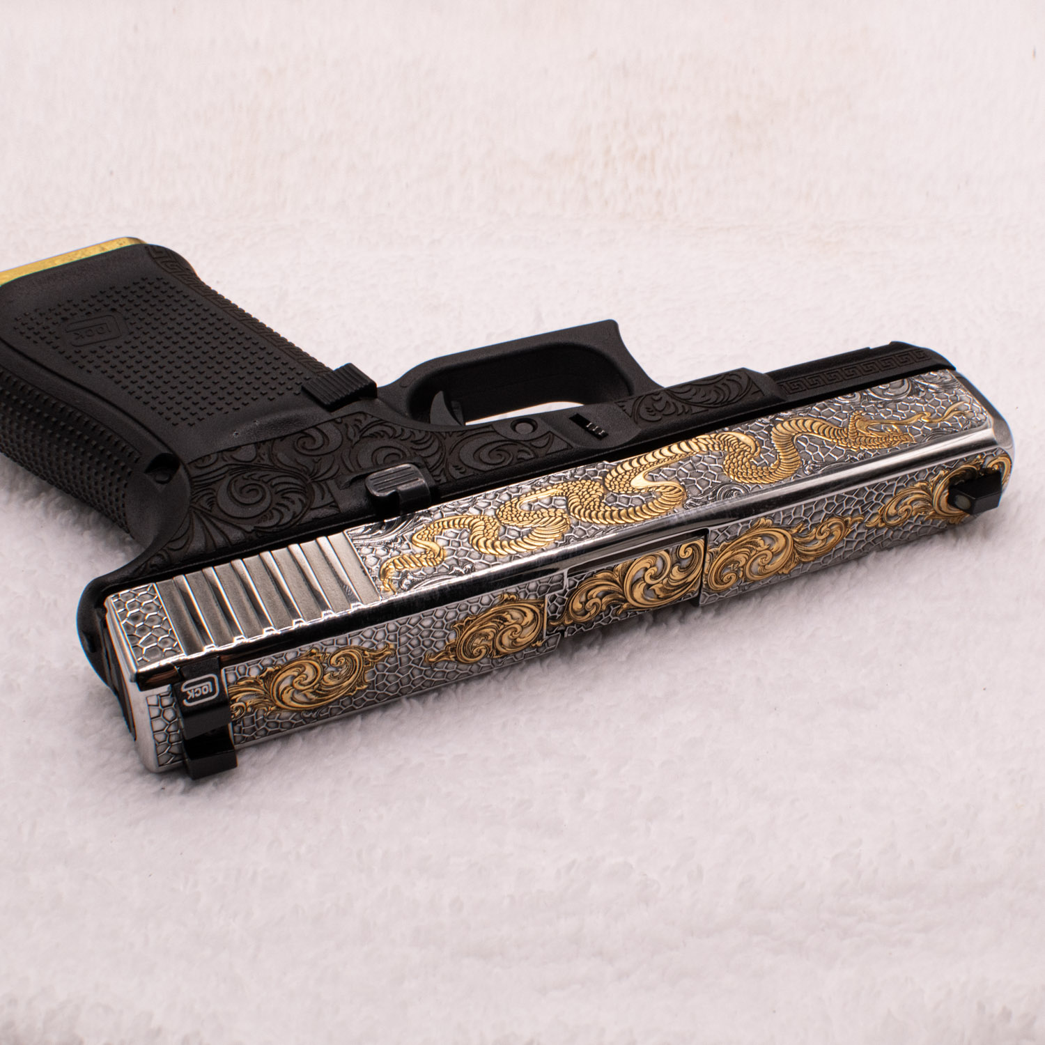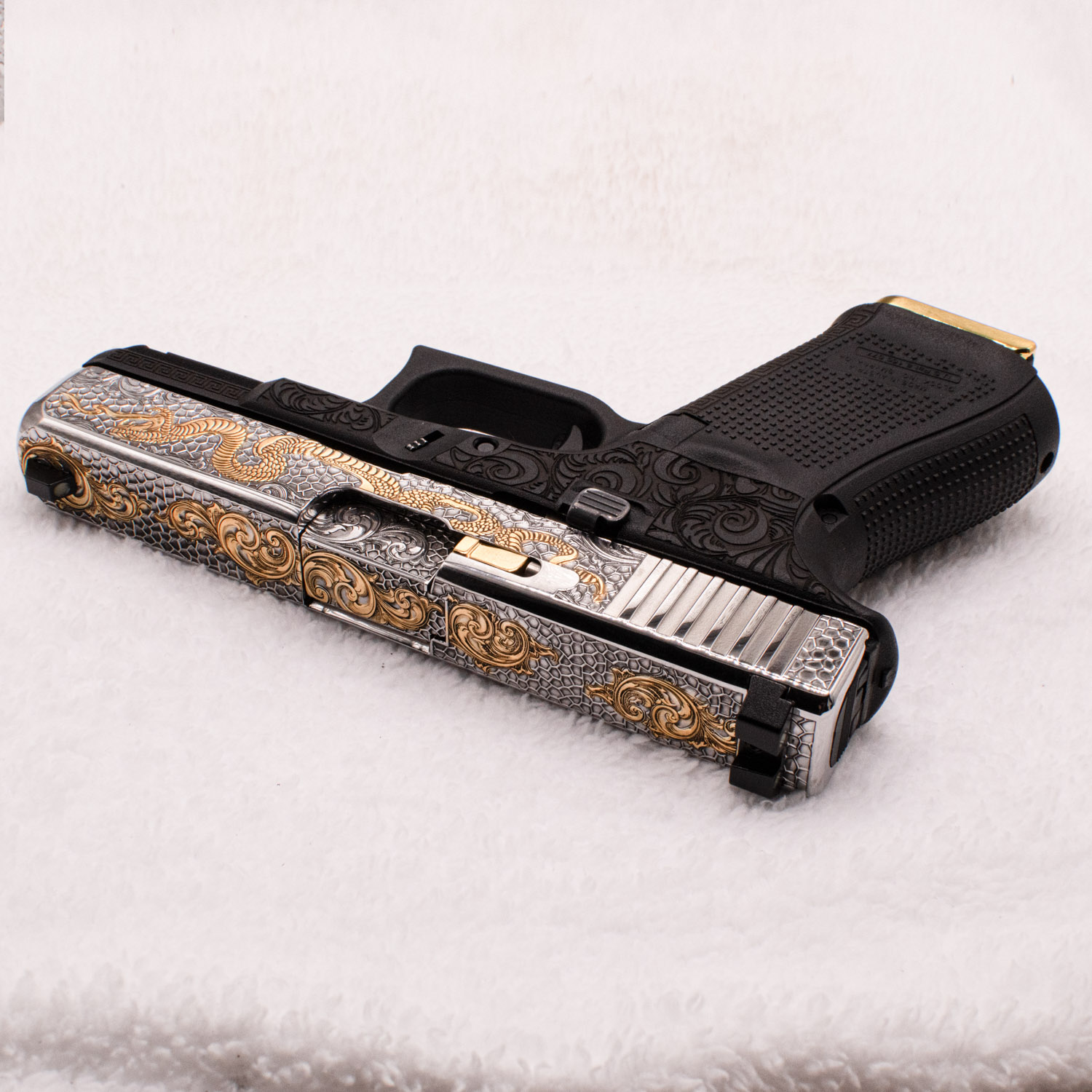 Glock 9 mm. 24 carats gold plated parts. Handmade. Custom engraved with classic design slide. Magazine with a gold plated bottom.