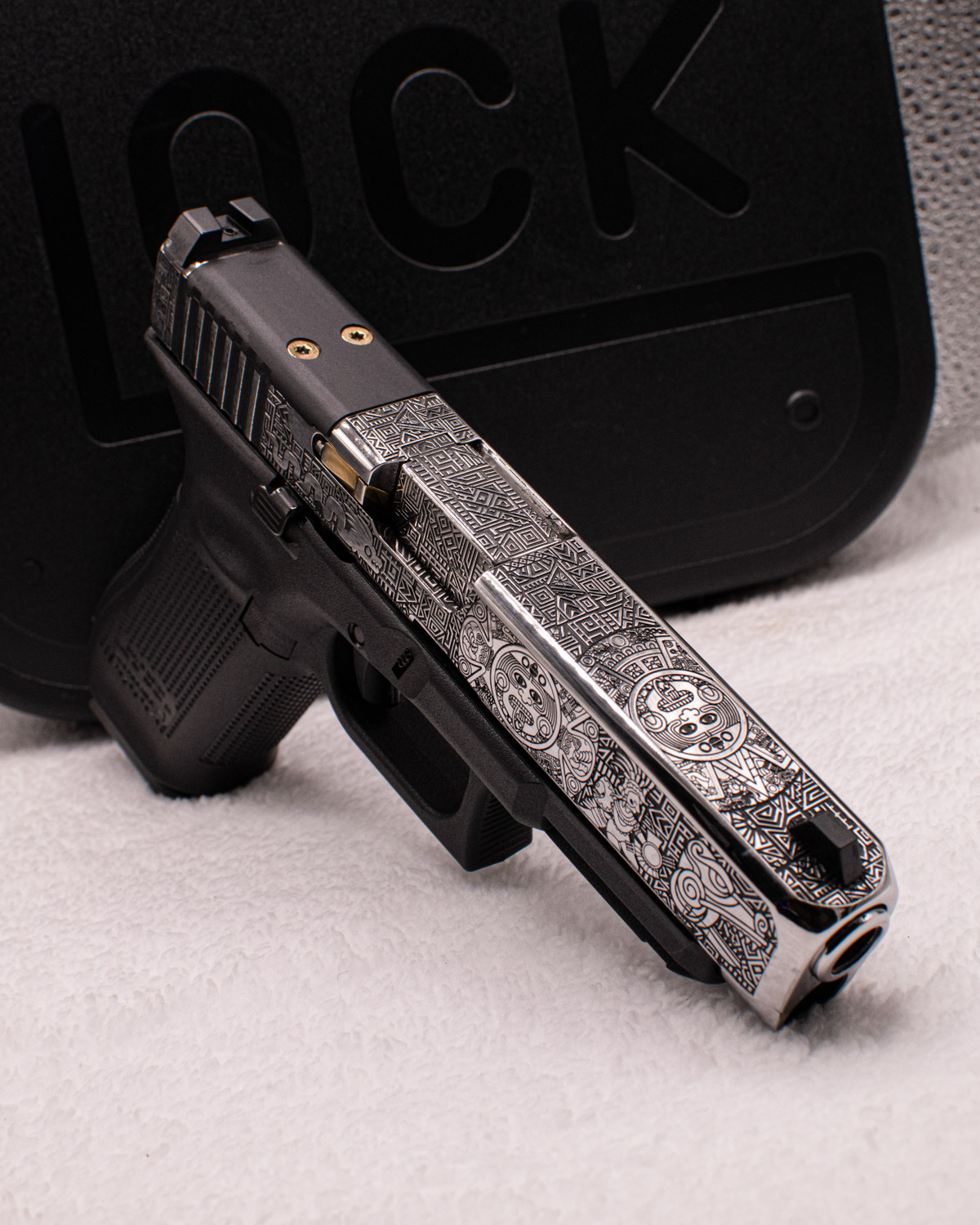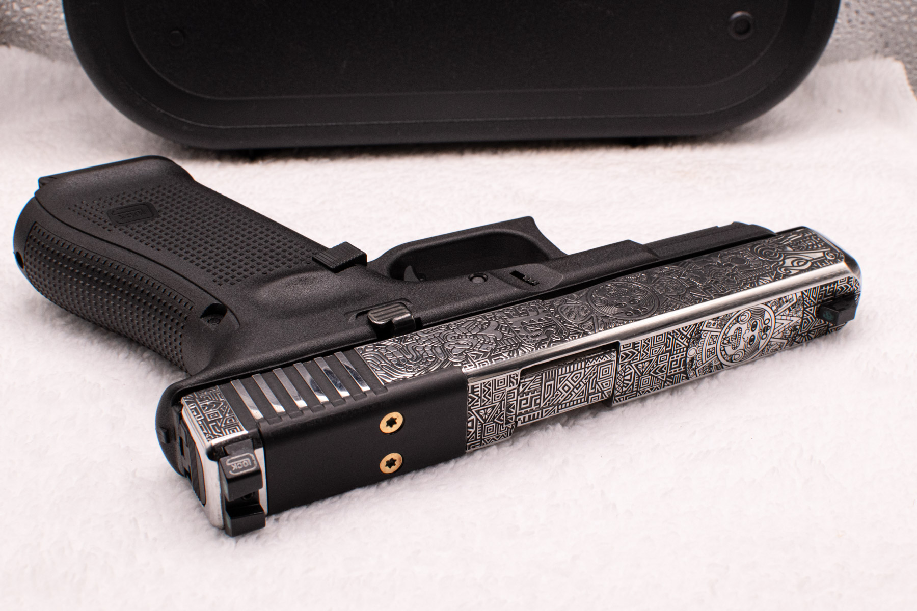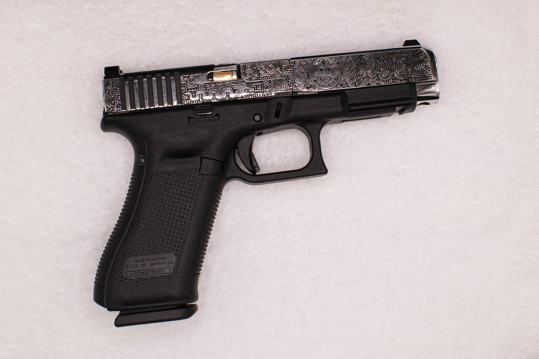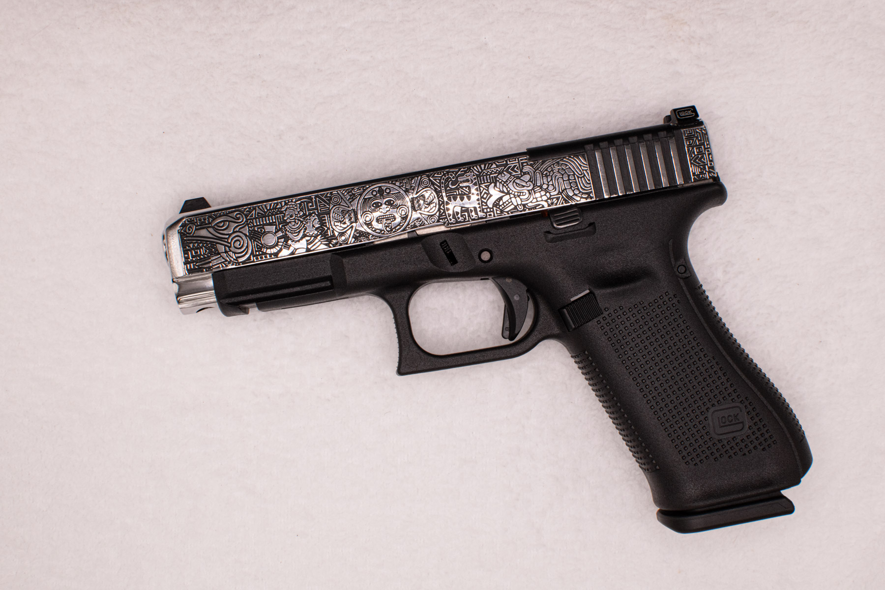 Glock 9mm. Custom engraved with exclusive design slide. High polished stainless steel. Black plastic frame.