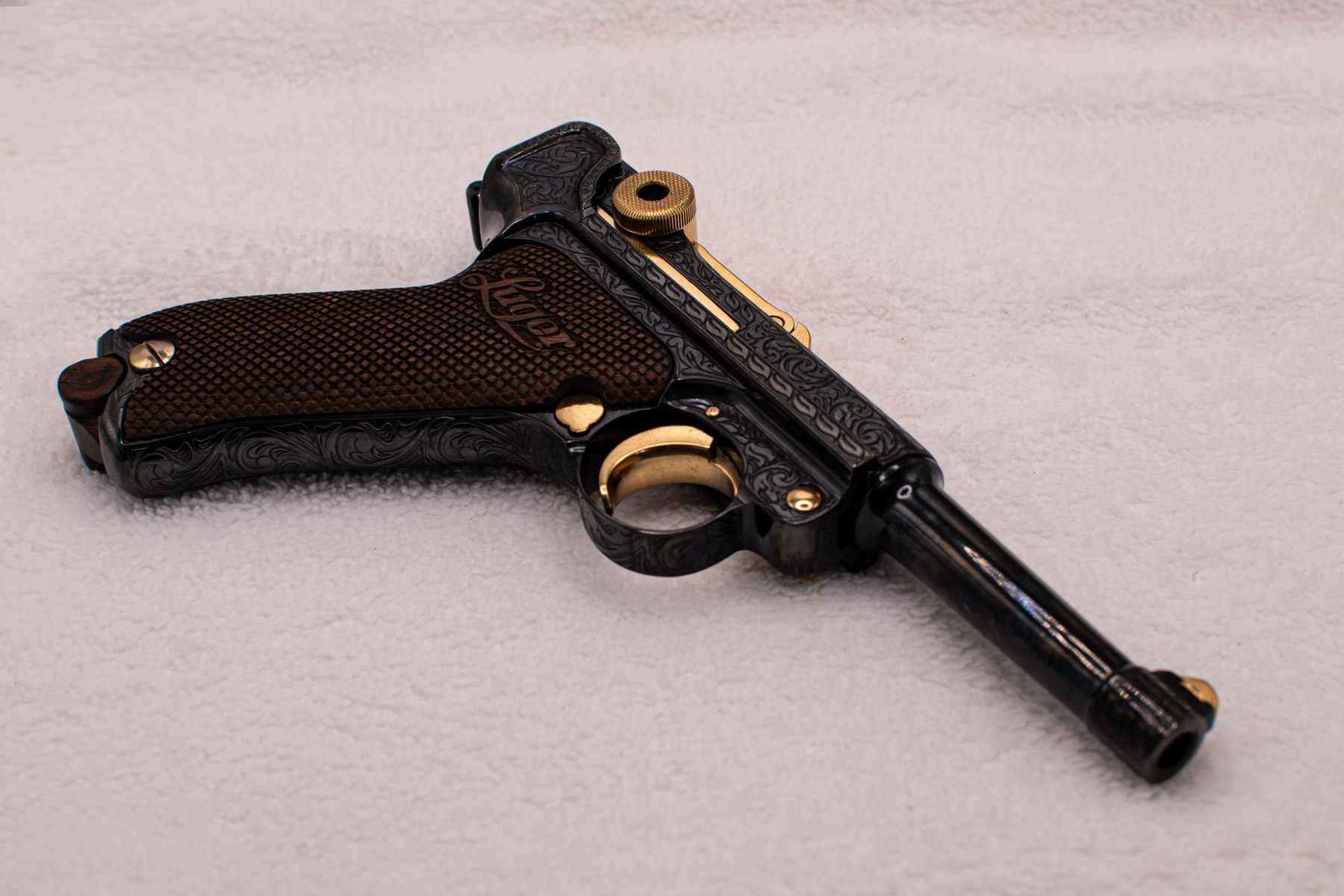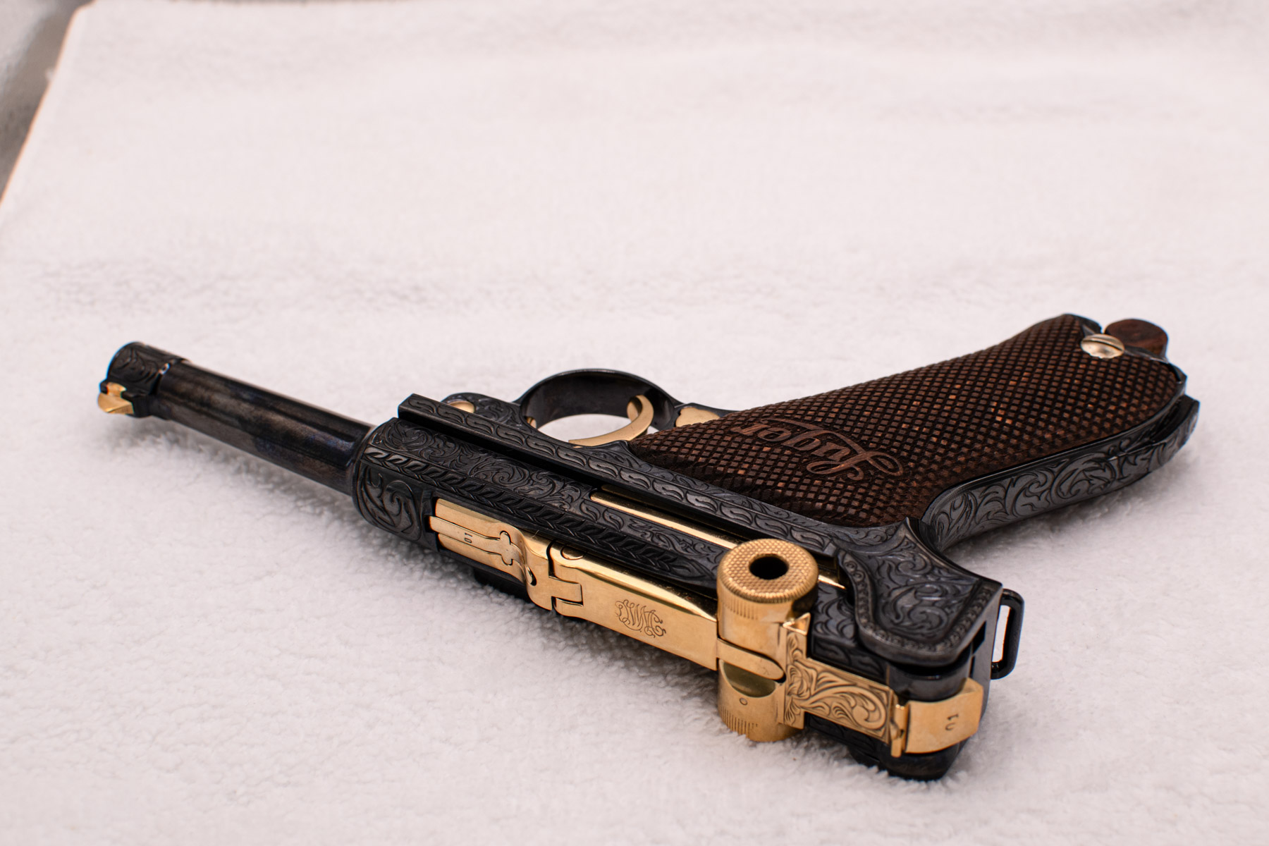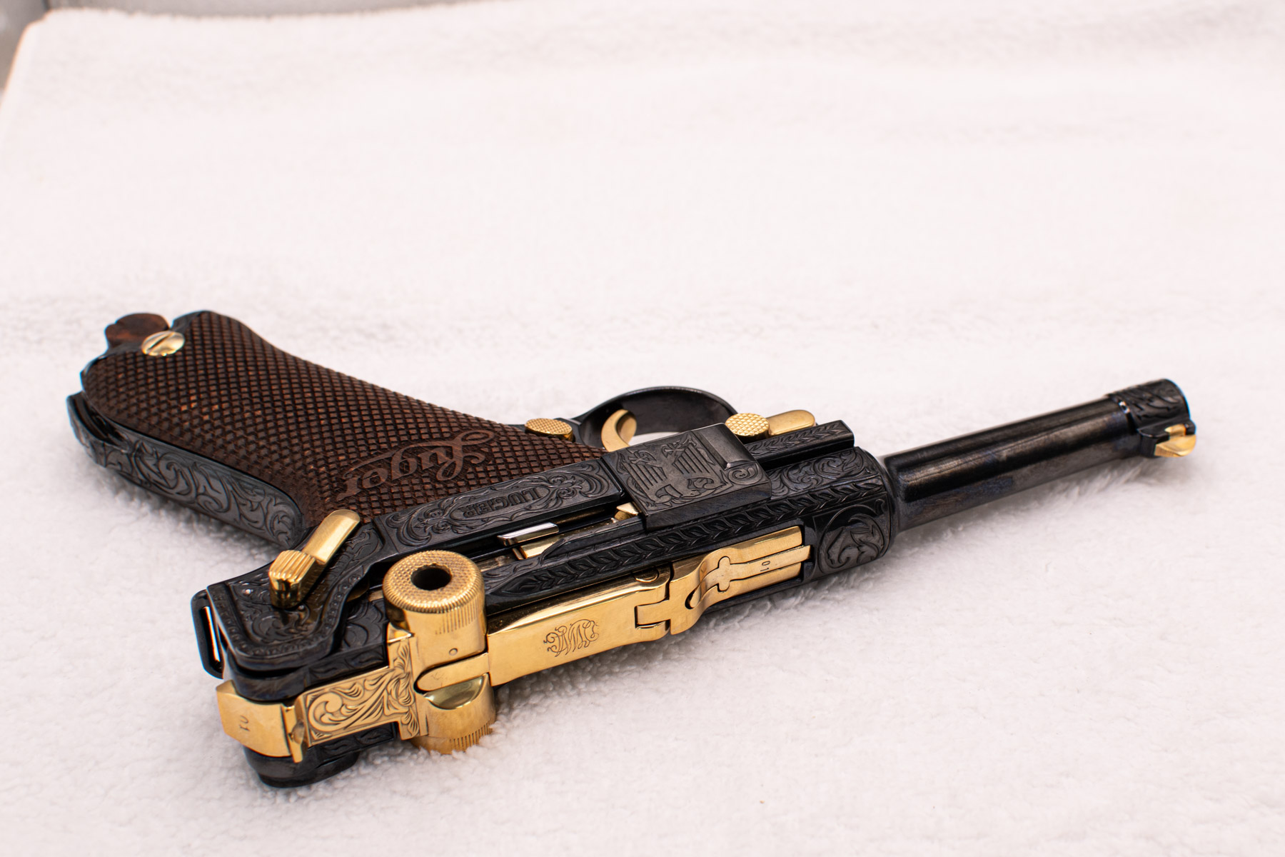 This exclusive Luger P08  is elevated to the level of fine art through its custom engraving and 24-karat gold-plated accents. The steel has been high-polished to a mirror finish.