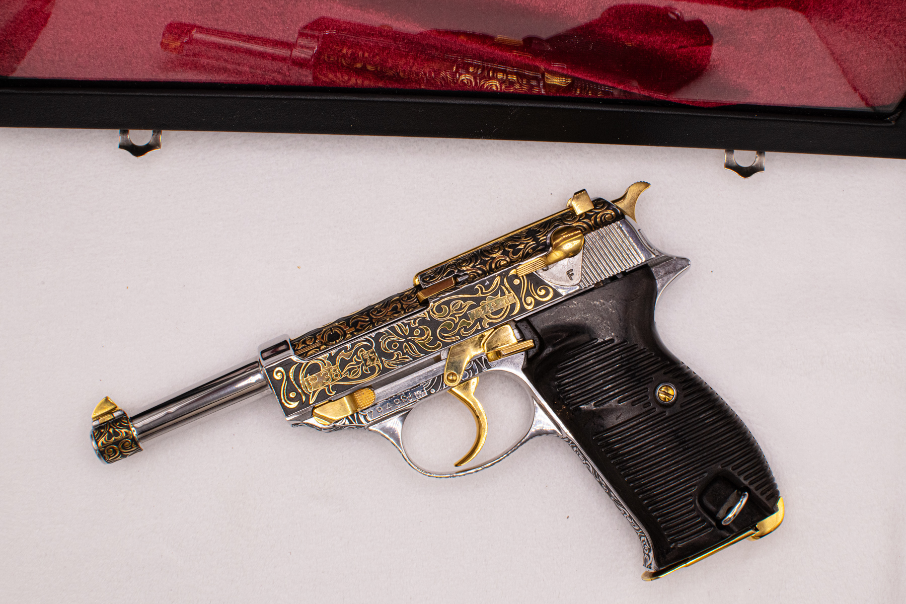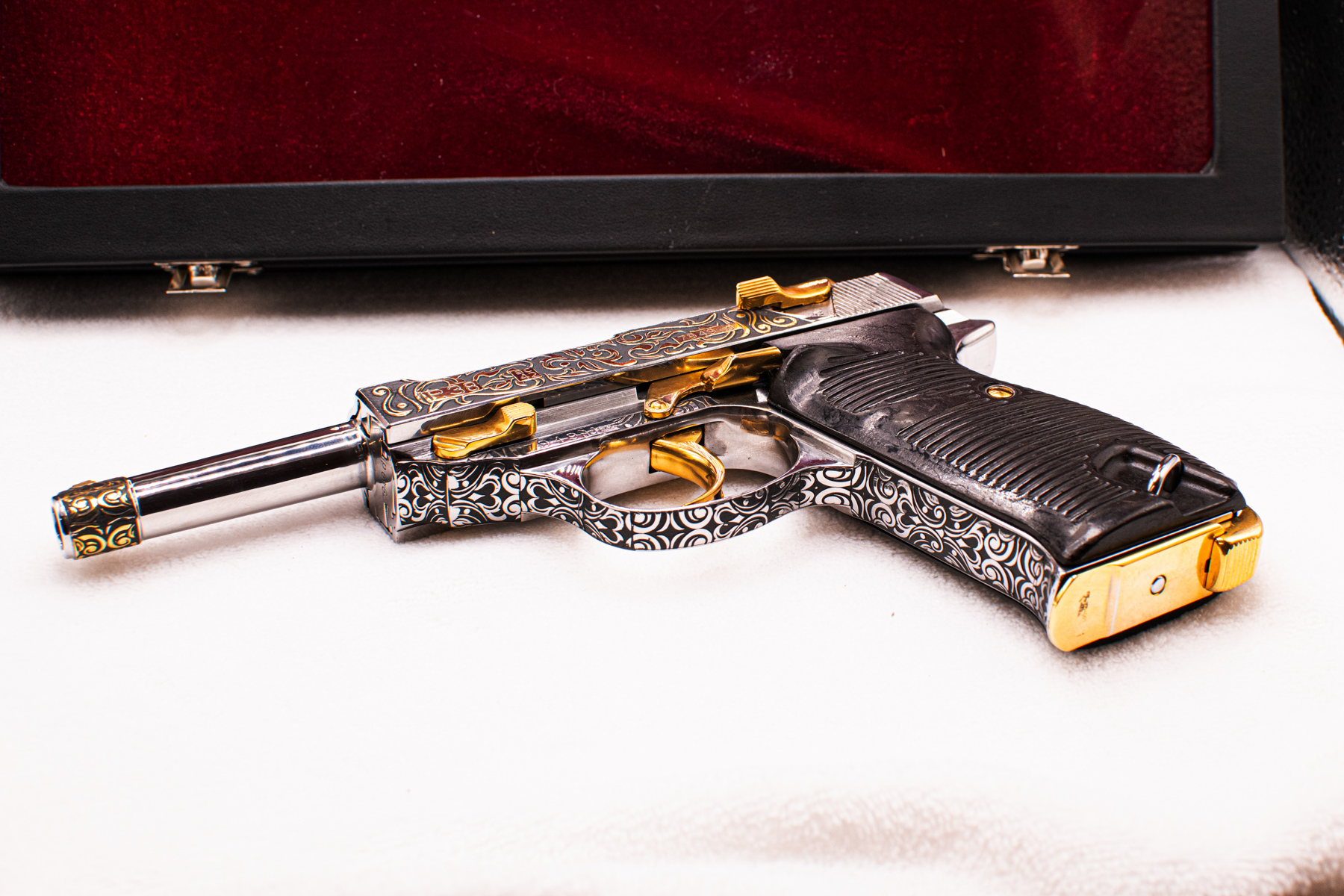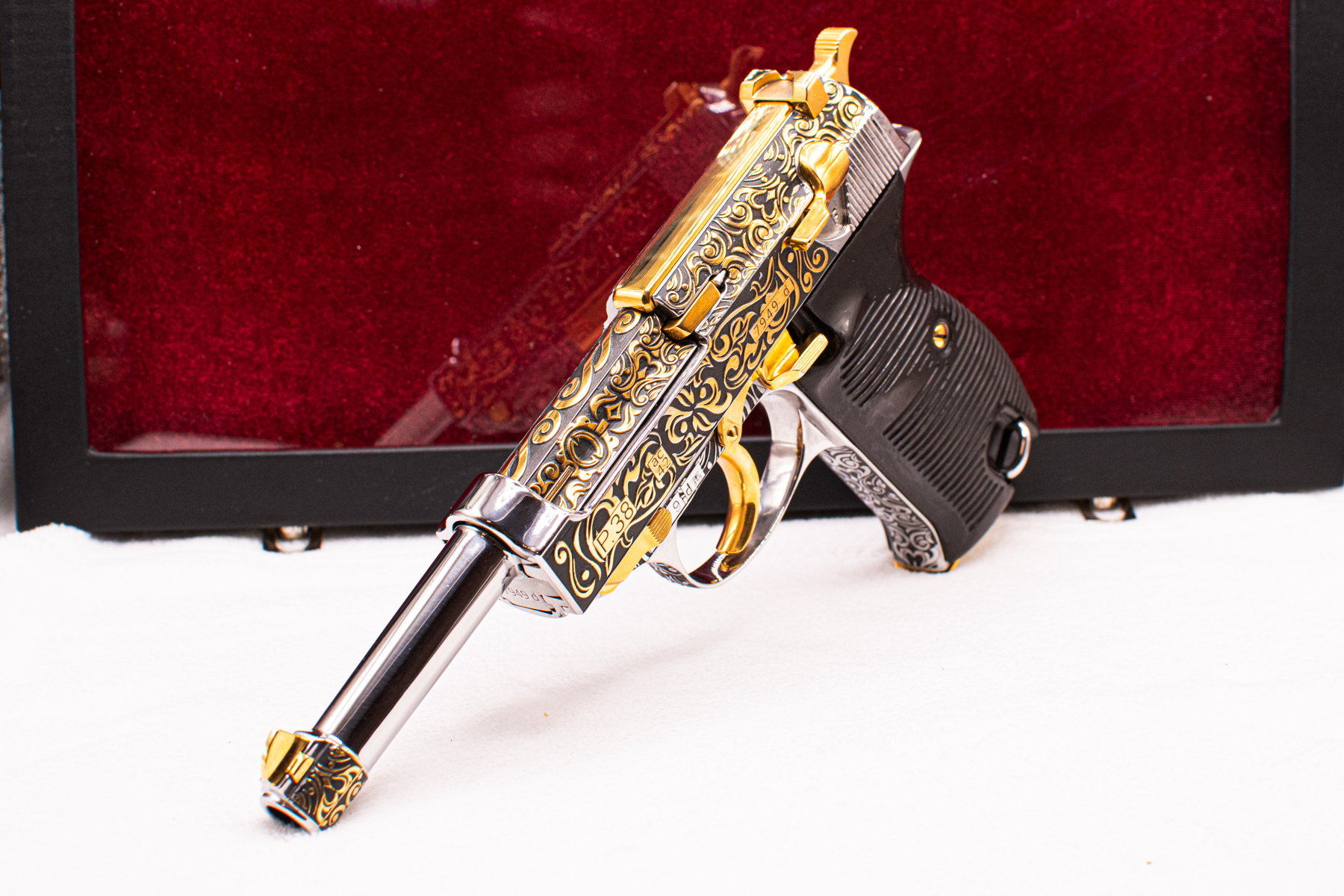 A true work of art — this custom pistol features hand engraving, 24K gold-plated details, and a hand-applied Royal Blue finish. Crafted from high-polished stainless steel or nickel-plated metal, it includes custom logo grips and a polished or gold-plated magazine base.